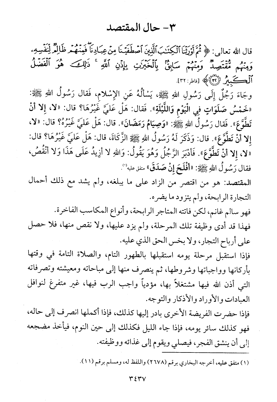 وجَاءَ رَجُلٌ إِلَى رَسُولِ اللهِ - صلى الله عليه وسلم -، يَسْألُهُ عَنِ الإِسْلامِ، فَقال رَسُولُ اللهِ - صلى الله عليه وسلم -: «خَمْسُ صَلَوَاتٍ فِي الْيَوْمِ وَاللَّيْلَةِ». فَقال: هَلْ عَلَيَّ غَيْرُهَا؟ قال: «لا، إِلا أنْ تَطَّوَّعَ». فَقال رَسُولُ اللهِ - صلى الله عليه وسلم -: «وَصِيَامُ رَمَضَانَ». قال: هَلْ عَلَيَّ غَيْرُهُ؟ قال: «لا، إِلا أنْ تَطَّوَّعَ». قال: وَذَكَرَ لَهُ رَسُولُ اللهِ - صلى الله عليه وسلم - الزَّكَاةَ، قال: هَلْ عَلَيَّ غَيْرُهَا؟ قال: «لا، إِلا أنْ تَطَّوَّعَ». فَأدْبَرَ الرَّجُلُ وَهُوَ يَقُولُ: وَاللهِ لا أزِيدُ عَلَى هَذَا وَلا أنْقُصُ، فقال رَسُولُ اللهِ - صلى الله عليه وسلم -: «أفْلَحَ إِنْ صَدَقَ» متفق عليه (¬1).