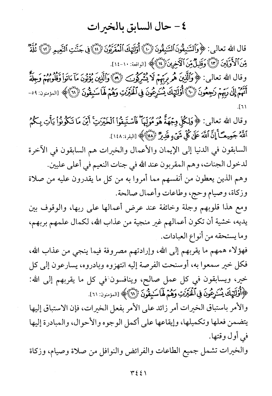 وقال الله تعالى: {وَالَّذِينَ هُمْ بِرَبِّهِمْ لَا يُشْرِكُونَ (59) وَالَّذِينَ يُؤْتُونَ مَا آتَوْا وَقُلُوبُهُمْ وَجِلَةٌ أَنَّهُمْ إِلَى رَبِّهِمْ رَاجِعُونَ (60) أُولَئِكَ يُسَارِعُونَ فِي الْخَيْرَاتِ وَهُمْ لَهَا سَابِقُونَ (61)} [المؤمنون: 59 - 61].