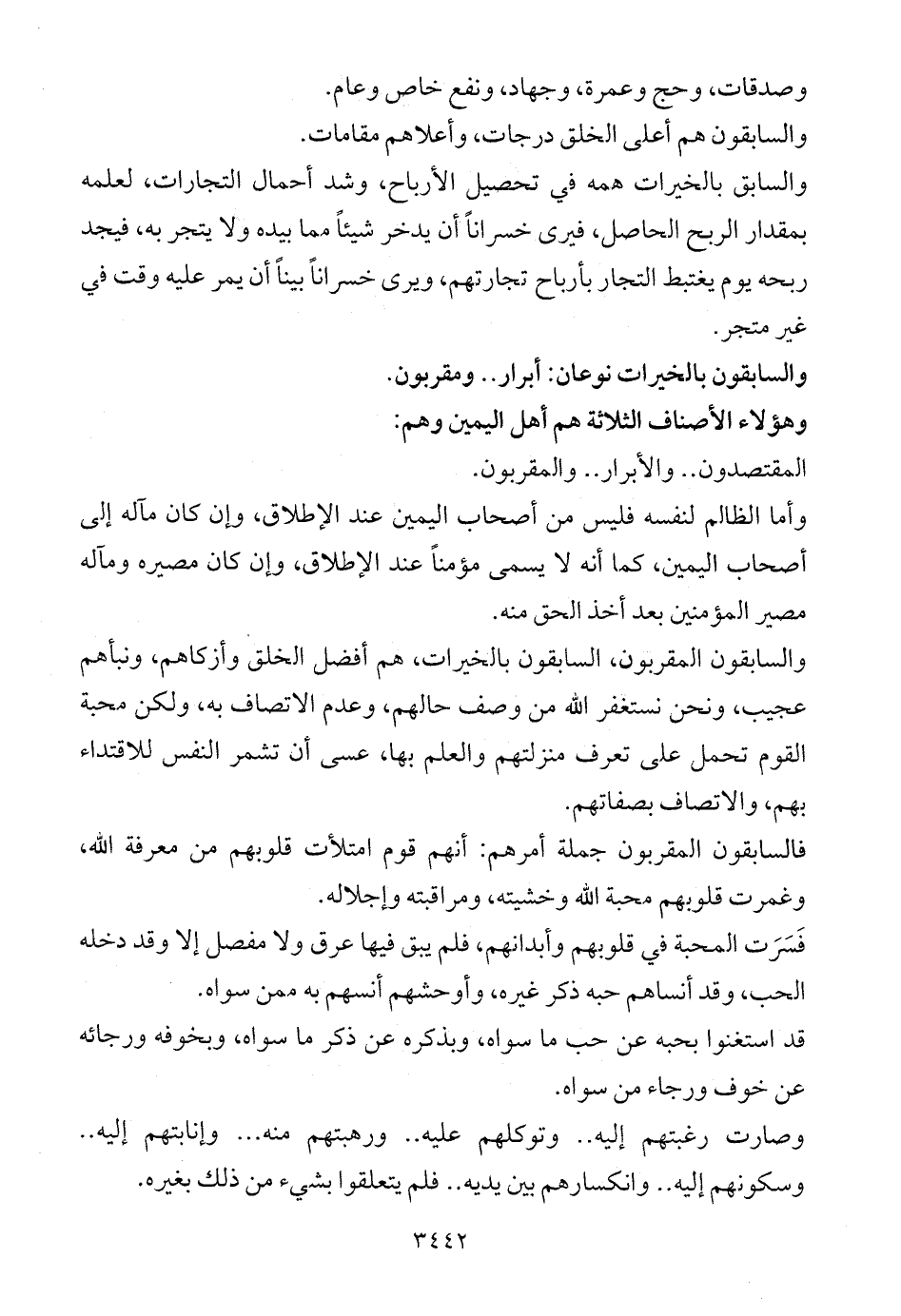 والسابقون المقربون، السابقون بالخيرات، هم أفضل الخلق وأزكاهم، ونبأهم عجيب، ونحن نستغفر الله من وصف حالهم، وعدم الاتصاف به، ولكن محبة القوم تحمل على تعرف منزلتهم والعلم بها، عسى أن تشمر النفس للاقتداء بهم، والاتصاف بصفاتهم.