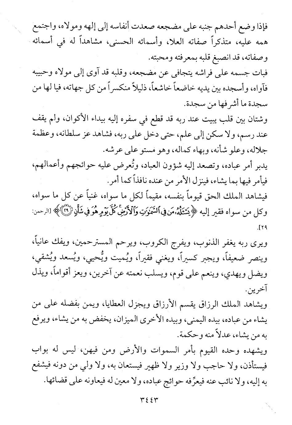 ويشهده وحده القيوم بأمر السموات والأرض ومن فيهن، ليس له بواب فيستأذن، ولا حاجب ولا وزير ولا ظهير فيستعان به، ولا ولي من دونه فيشفع به إليه، ولا نائب عنه فيعرِّفه حوائج عباده، ولا معين له فيعاونه على قضائها.
