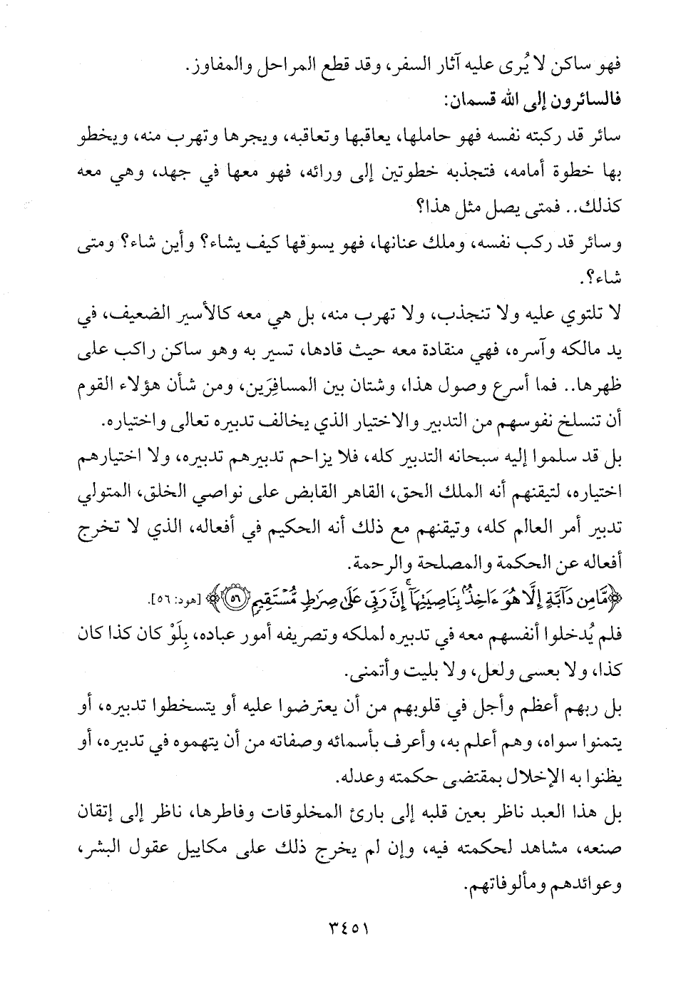 لا تلتوي عليه ولا تنجذب، ولا تهرب منه، بل هي معه كالأسير الضعيف، في يد مالكه وآسره، فهي منقادة معه حيث قادها، تسير به وهو ساكن راكب على ظهرها .. فما أسرع وصول هذا، وشتان بين المسافِرَين، ومن شأن هؤلاء القوم أن تنسلخ نفوسهم من التدبير والاختيار الذي يخالف تدبيره تعالى واختياره.