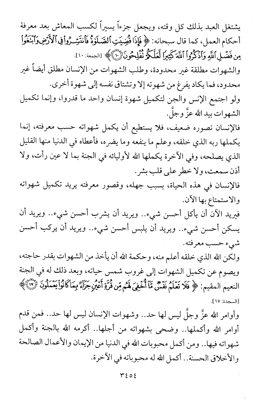 وأوامر الله عزَّ وجلَّ ليس لها حد .. وشهوات الإنسان ليس لها حد .. فمن قدم أوامر الله وأكملها .. وضحى بشهواته من أجلها .. أكرمه الله بالجنة وأكمل شهواته فيها .. ومن أكمل محبوبات الله في الدنيا من الإيمان والأعمال الصالحة والأخلاق الحسنة .. أكمل الله له محبوباته في الآخرة.