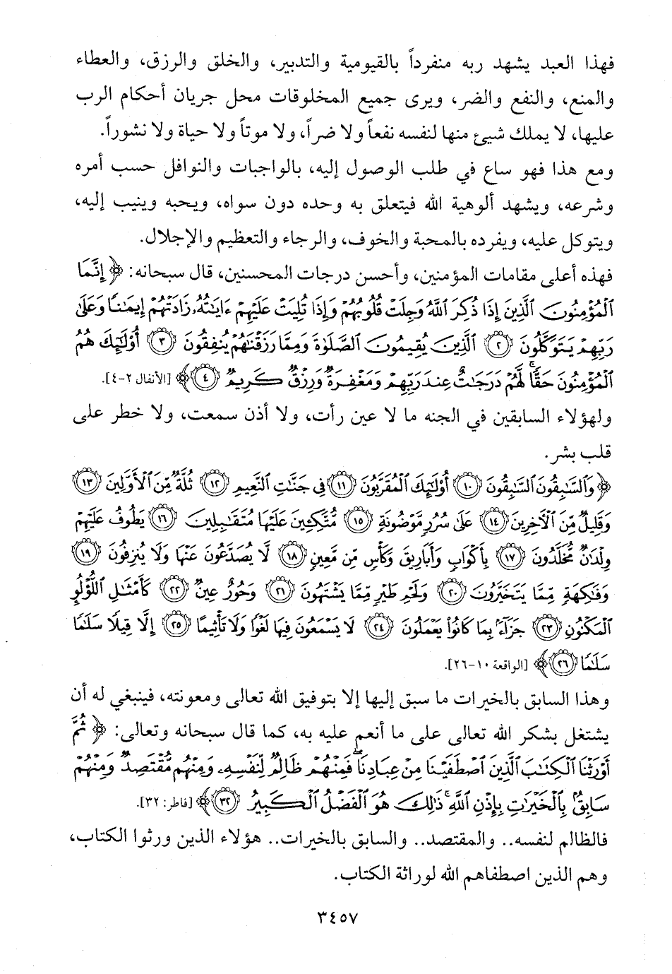 فهذه أعلى مقامات المؤمنين، وأحسن درجات المحسنين، قال سبحانه: {إِنَّمَا الْمُؤْمِنُونَ الَّذِينَ إِذَا ذُكِرَ اللَّهُ وَجِلَتْ قُلُوبُهُمْ وَإِذَا تُلِيَتْ عَلَيْهِمْ آيَاتُهُ زَادَتْهُمْ إِيمَانًا وَعَلَى رَبِّهِمْ يَتَوَكَّلُونَ (2) الَّذِينَ يُقِيمُونَ الصَّلَاةَ وَمِمَّا رَزَقْنَاهُمْ يُنْفِقُونَ (3) أُولَئِكَ هُمُ الْمُؤْمِنُونَ حَقًّا لَهُمْ دَرَجَاتٌ عِنْدَ رَبِّهِمْ وَمَغْفِرَةٌ وَرِزْقٌ كَرِيمٌ (4)} [الأنفال 2 - 4].