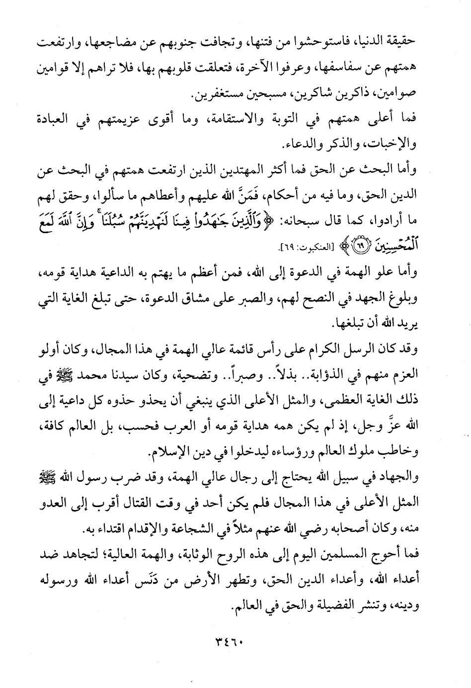 والجهاد في سبيل الله يحتاج إلى رجال عالي الهمة، وقد ضرب رسول الله (المثل الأعلى في هذا المجال فلم يكن أحد في وقت القتال أقرب إلى العدو منه، وكان أصحابه رضي الله عنهم مثلاً في الشجاعة والإقدام اقتداء به.