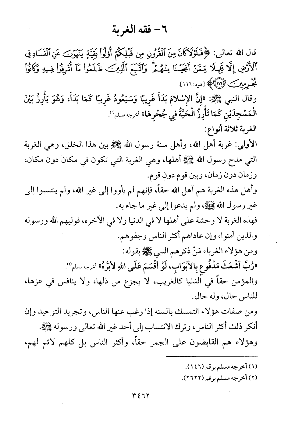 الأولى: غربة أهل الله، وأهل سنة رسول الله (بين هذا الخلق، وهي الغربة التي مدح رسول الله (أهلها، وهي الغربة التي تكون في مكان دون مكان، وزمان دون زمان، وبين قوم دون قوم.
