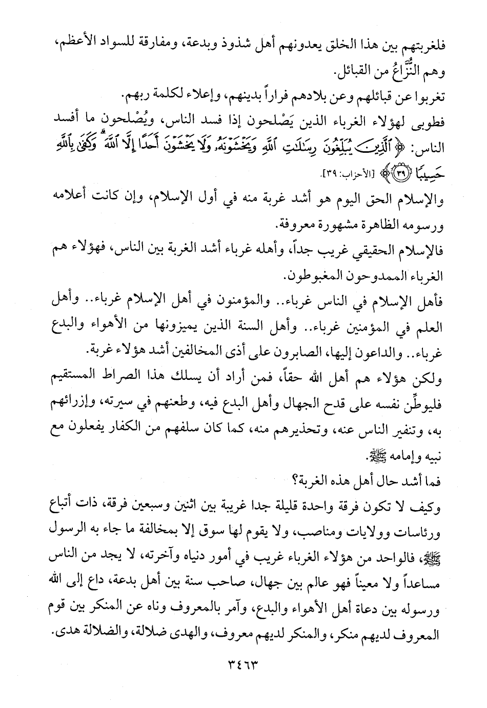 فأهل الإسلام في الناس غرباء .. والمؤمنون في أهل الإسلام غرباء .. وأهل العلم في المؤمنين غرباء .. وأهل السنة الذين يميزونها من الأهواء والبدع غرباء .. والداعون إليها، الصابرون على أذى المخالفين أشد هؤلاء غربة.