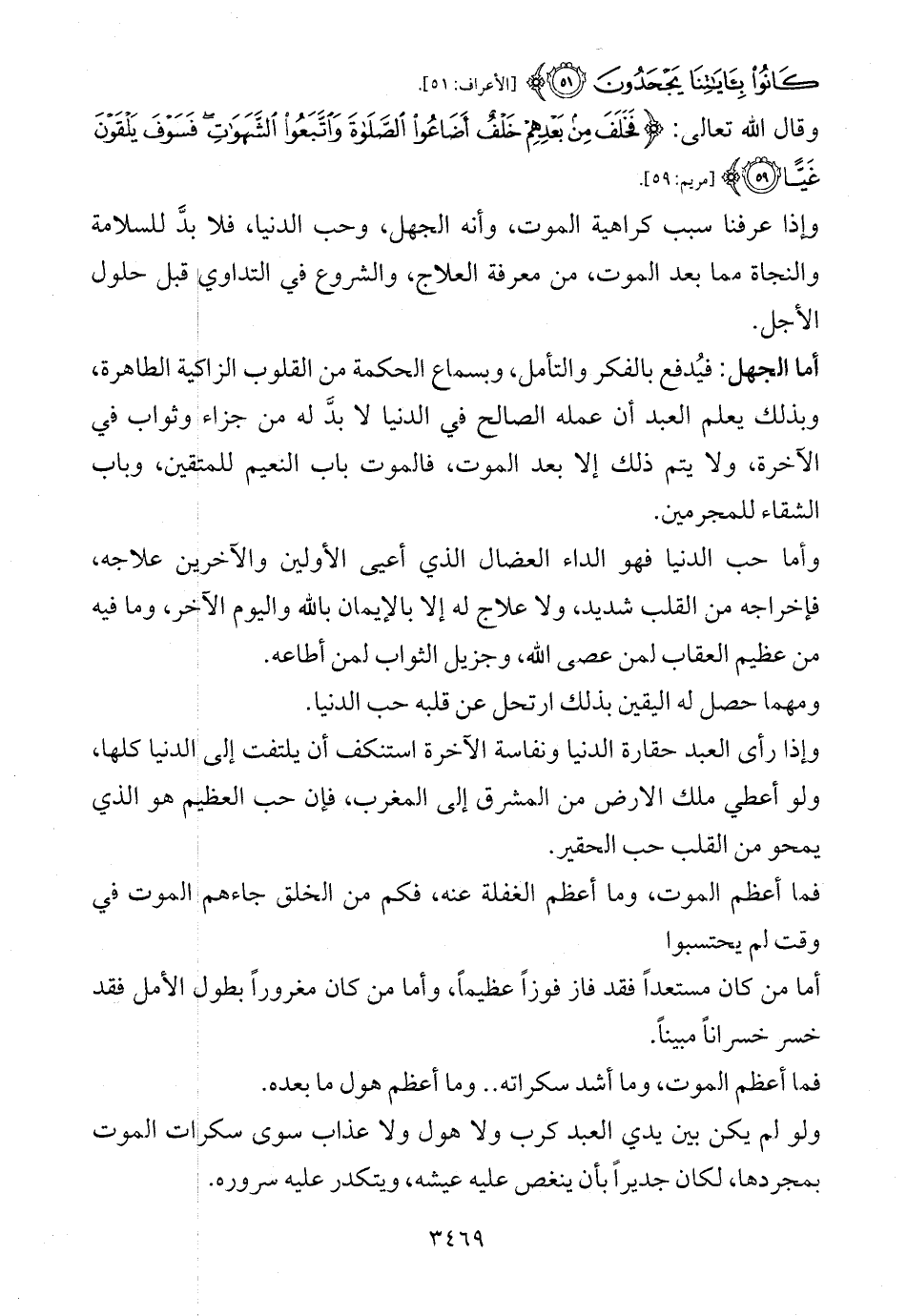 أما الجهل: فيُدفع بالفكر والتأمل، وبسماع الحكمة من القلوب الزاكية الطاهرة، وبذلك يعلم العبد أن عمله الصالح في الدنيا لا بدَّ له من جزاء وثواب في الآخرة، ولا يتم ذلك إلا بعد الموت، فالموت باب النعيم للمتقين، وباب الشقاء للمجرمين.