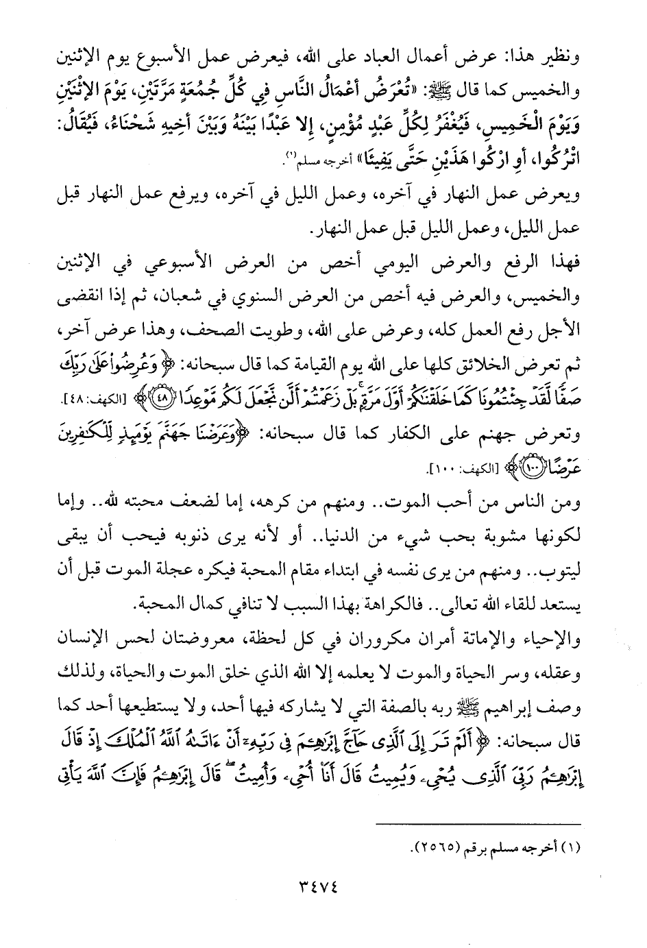 ونظير هذا: عرض أعمال العباد على الله، فيعرض عمل الأسبوع يوم الإثنين والخميس كما قال - صلى الله عليه وسلم -: «تُعْرَضُ أعْمَالُ النَّاسِ فِي كُلِّ جُمُعَةٍ مَرَّتَيْنِ، يَوْمَ الإثْنَيْنِ وَيَوْمَ الْخَمِيسِ، فَيُغْفَرُ لِكُلِّ عَبْدٍ مُؤْمِنٍ، إِلا عَبْدًا بَيْنَهُ وَبَيْنَ أخِيهِ شَحْنَاءُ، فَيُقَالُ: اتْرُكُوا، أوِ ارْكُوا هَذَيْنِ حَتَّى يَفِيئَا» أخرجه مسلم (¬1).