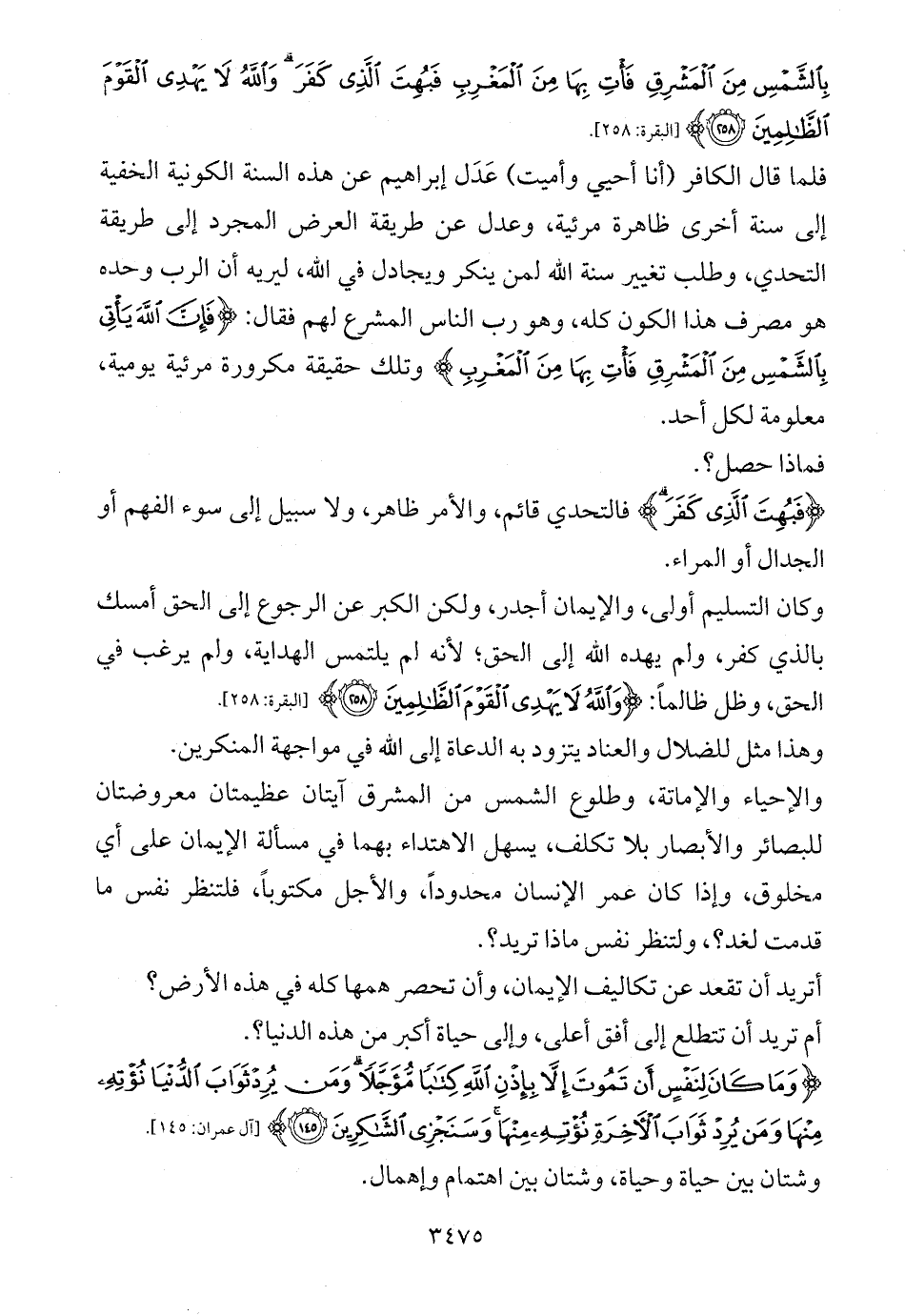 فلما قال الكافر (أنا أحيي وأميت) عَدَل إبراهيم عن هذه السنة الكونية الخفية إلى سنة أخرى ظاهرة مرئية، وعدل عن طريقة العرض المجرد إلى طريقة التحدي، وطلب تغيير سنة الله لمن ينكر ويجادل في الله، ليريه أن الرب وحده هو مصرف هذا الكون كله، وهو رب الناس المشرع لهم فقال: {فَإِنَّ اللَّهَ يَأْتِي بِالشَّمْسِ مِنَ الْمَشْرِقِ فَأْتِ بِهَا مِنَ الْمَغْرِبِ} وتلك حقيقة مكرورة مرئية يومية، معلومة لكل أحد.