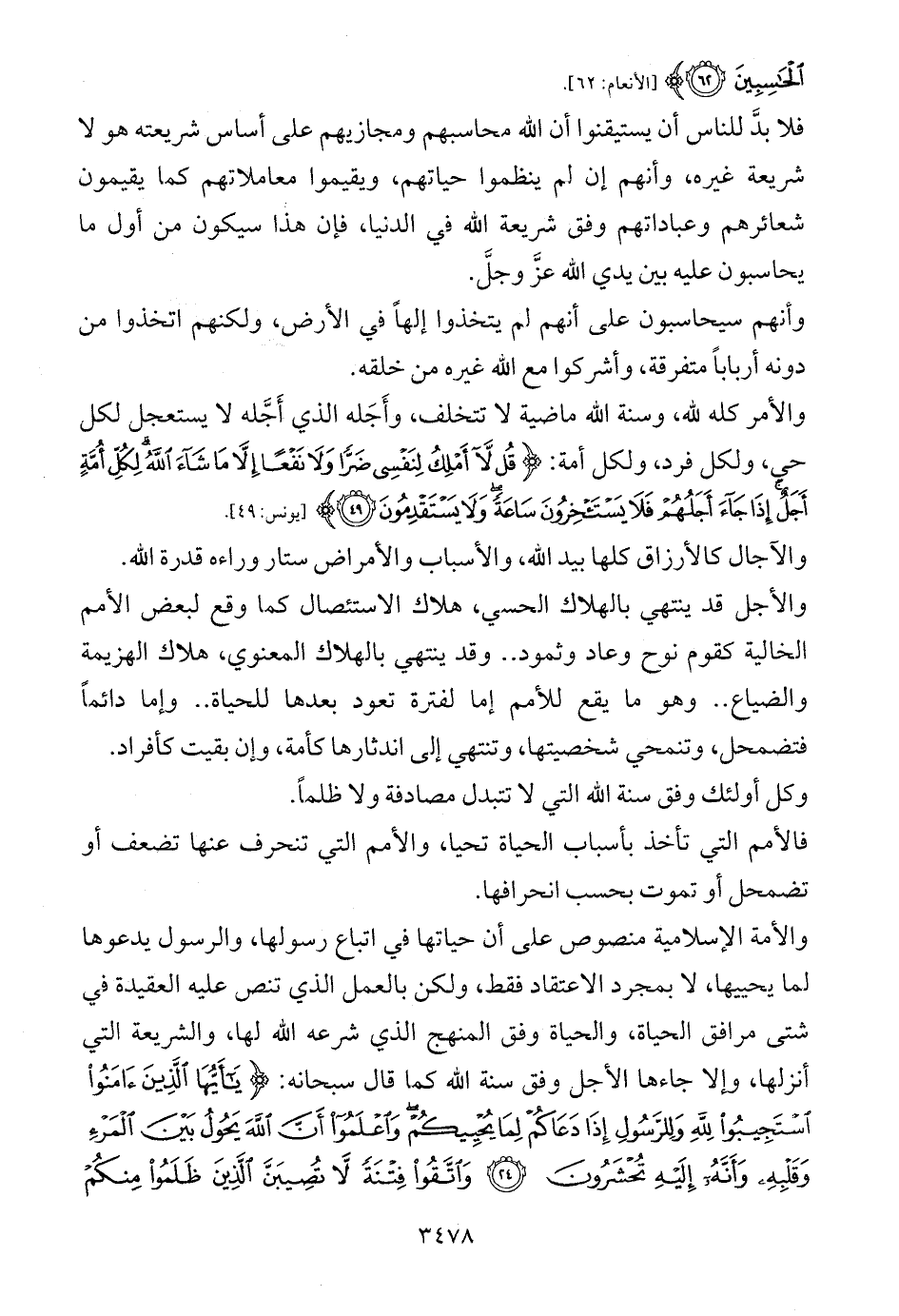 والأمة الإسلامية منصوص على أن حياتها في اتباع رسولها، والرسول يدعوها لما يحييها، لا بمجرد الاعتقاد فقط، ولكن بالعمل الذي تنص عليه العقيدة في شتى مرافق الحياة، والحياة وفق المنهج الذي شرعه الله لها، والشريعة التي أنزلها، وإلا جاءها الأجل وفق سنة الله كما قال سبحانه: {يَاأَيُّهَا الَّذِينَ آمَنُوا اسْتَجِيبُوا لِلَّهِ وَلِلرَّسُولِ إِذَا دَعَاكُمْ لِمَا يُحْيِيكُمْ وَاعْلَمُوا أَنَّ اللَّهَ يَحُولُ بَيْنَ الْمَرْءِ وَقَلْبِهِ وَأَنَّهُ إِلَيْهِ تُحْشَرُونَ (24) وَاتَّقُوا فِتْنَةً لَا تُصِيبَنَّ الَّذِينَ ظَلَمُوا مِنْكُمْ