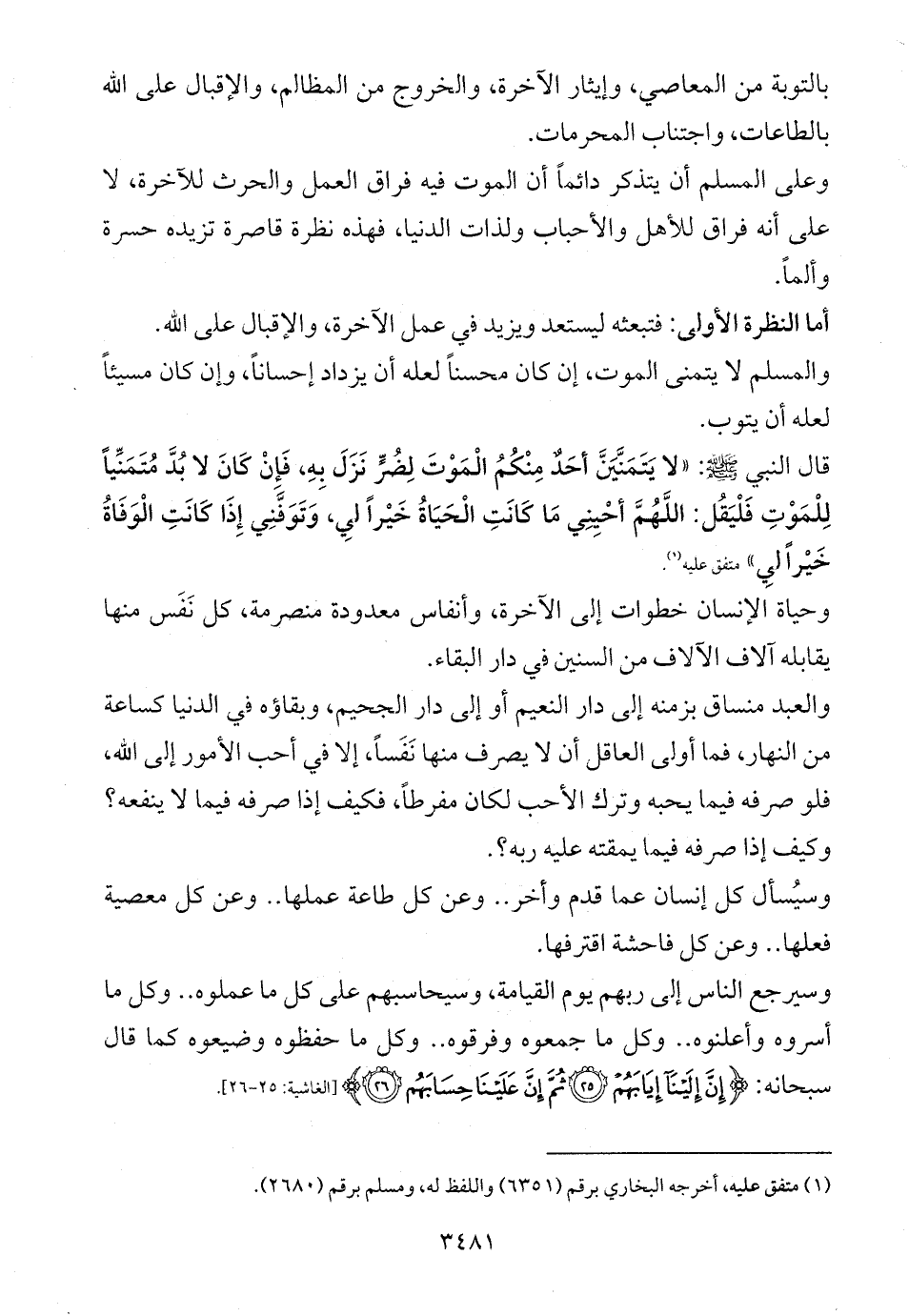 قال النبي - صلى الله عليه وسلم -: «لا يَتَمَنَّيَنَّ أحَدٌ مِنْكُمُ الْمَوْتَ لِضُرٍّ نَزَلَ بِهِ، فَإِنْ كَانَ لا بُدَّ مُتَمَنِّياً لِلْمَوْتِ فَلْيَقُل: اللَّهُمَّ أحْيِنِي مَا كَانَتِ الْحَيَاةُ خَيْراً لِي، وَتَوَفَّنِي إِذَا كَانَتِ الْوَفَاةُ خَيْراً لِي» متفق عليه (¬1).