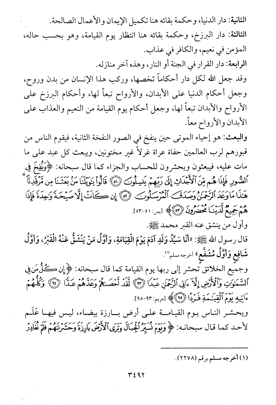 والبعث: هو إحياء الموتى حين ينفخ في الصور النفخة الثانية، فيقوم الناس من قبورهم لرب العالمين حفاة عراة غرلاً غير مختونين، ويبعث كل عبد على ما مات عليه، فيبعثون ويحشرون للحساب والجزاء كما قال سبحانه: {وَنُفِخَ فِي الصُّورِ فَإِذَا هُمْ مِنَ الْأَجْدَاثِ إِلَى رَبِّهِمْ يَنْسِلُونَ (51) قَالُوا يَاوَيْلَنَا مَنْ بَعَثَنَا مِنْ مَرْقَدِنَا هَذَا مَا وَعَدَ الرَّحْمَنُ وَصَدَقَ الْمُرْسَلُونَ (52) إِنْ كَانَتْ إِلَّا صَيْحَةً وَاحِدَةً فَإِذَا هُمْ جَمِيعٌ لَدَيْنَا مُحْضَرُونَ (53)} ... [يس: 51 - 53].
