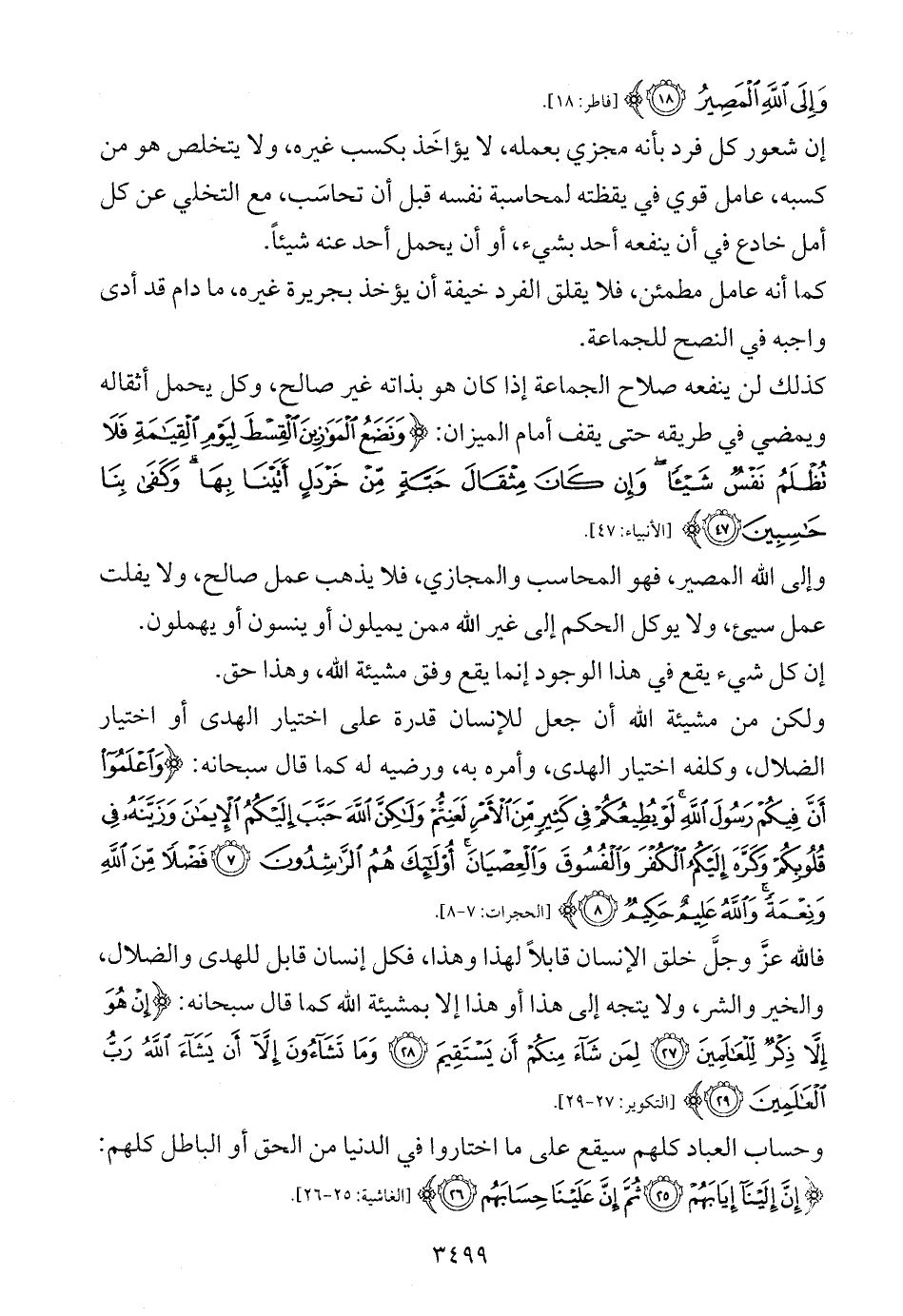 إن شعور كل فرد بأنه مجزي بعمله، لا يؤاخَذ بكسب غيره، ولا يتخلص هو من كسبه، عامل قوي في يقظته لمحاسبة نفسه قبل أن تحاسَب، مع التخلي عن كل أمل خادع في أن ينفعه أحد بشيء، أو أن يحمل أحد عنه شيئاً.