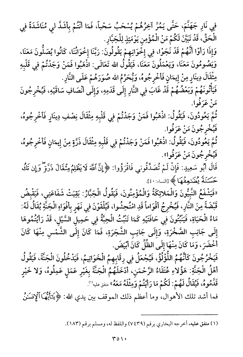 وَإِذَا رَأوْا أنَّهُمْ قَدْ نَجَوْا، فِي إِخْوَانِهِمْ يَقُولُونَ: رَبَّنَا إِخْوَانُنَا، كَانُوا يُصَلُّونَ مَعَنَا، وَيَصُومُونَ مَعَنَا، وَيَعْمَلُونَ مَعَنَا، فَيَقُولُ الله تَعَالَى: اذْهَبُوا فَمَنْ وَجَدْتُمْ فِي قَلْبِهِ مِثْقَالَ دِينَارٍ مِنْ إِيمَانٍ فَأخْرِجُوهُ، وَيُّحَرِّمُ الله صُوَرَهُمْ عَلَى النَّارِ.