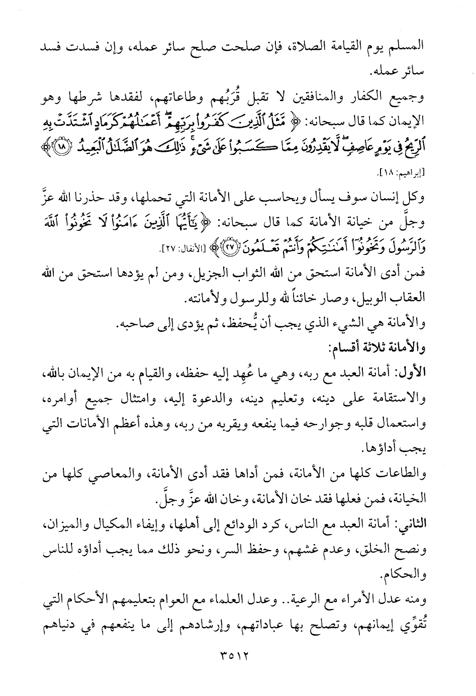 الأول: أمانة العبد مع ربه، وهي ما عُهِد إليه حفظه، والقيام به من الإيمان بالله، والاستقامة على دينه، وتعليم دينه، والدعوة إليه، وامتثال جميع أوامره، واستعمال قلبه وجوارحه فيما ينفعه ويقربه من ربه، وهذه أعظم الأمانات التي يجب أداؤها.