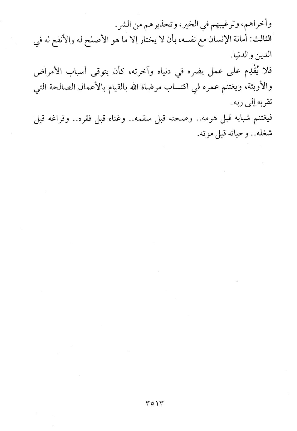 فيغتنم شبابه قبل هرمه .. وصحته قبل سقمه .. وغناه قبل فقره .. وفراغه قبل شغله .. وحياته قبل موته.