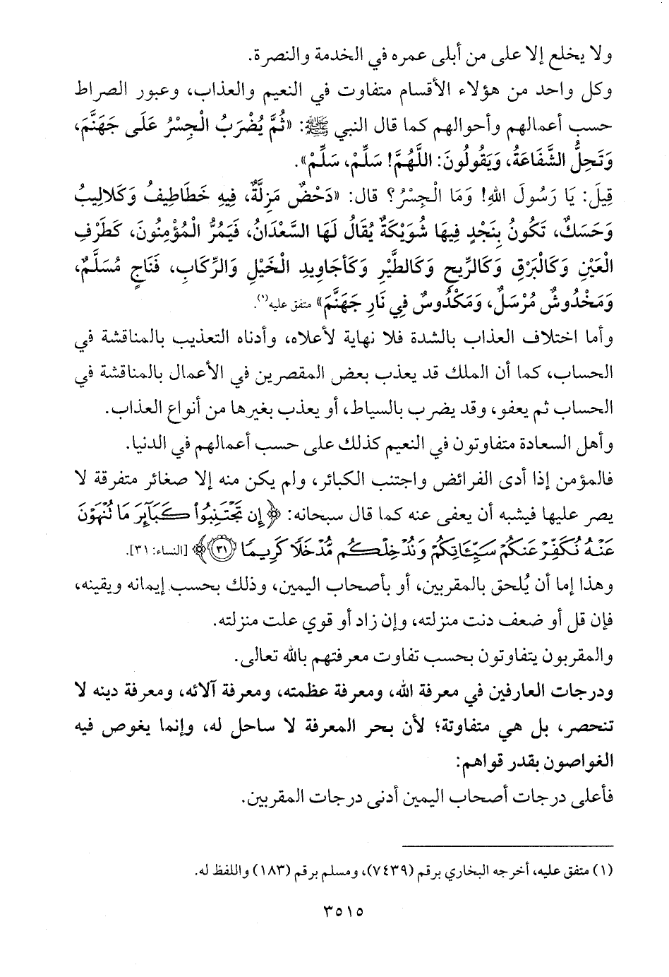 وكل واحد من هؤلاء الأقسام متفاوت في النعيم والعذاب، وعبور الصراط حسب أعمالهم وأحوالهم كما قال النبي - صلى الله عليه وسلم -: «ثُمَّ يُضْرَبُ الْجِسْرُ عَلَى جَهَنَّمَ، وَتَحِلُّ الشَّفَاعَةُ، وَيَقُولُونَ: اللَّهُمَّ! سَلِّمْ، سَلِّمْ».