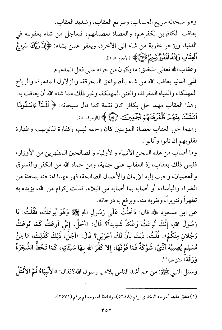 عن ابن مسعود - رضي الله عنه - قال: دَخَلْتُ عَلَى رَسُولِ اللهِ - صلى الله عليه وسلم - وَهُوَ يُوعَكُ، فَقُلْتُ: يَا رَسُولَ اللهِ، إِنَّكَ تُوعَكُ وَعْكاً شَدِيداً؟ قَالَ: «أجَلْ، إِنِّي أوعَكُ كَمَا يُوعَكُ رَجُلانِ مِنْكُمْ». قُلْتُ: ذَلِكَ بأنَّ لَكَ أجْرَيْنِ؟ قَالَ: «أجَلْ، ذَلِكَ كَذَلِكَ، مَا مِنْ مُسْلِمٍ يُصِيبُهُ أذًىً، شَوْكَةٌ فَمَا فَوْقَهَا، إِلا كَفَّرَ الله بِهَا سَيِّئَاتِهِ، كَمَا تَحُطُّ الشَّجَرَةُ وَرَقَهَ» متفق عليه (¬1).