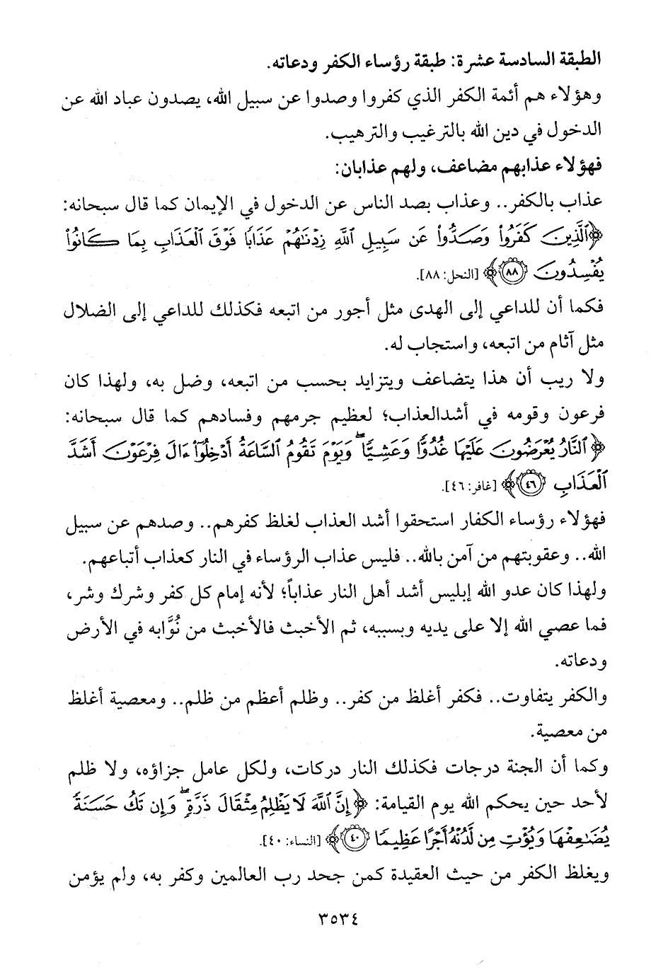 ولا ريب أن هذا يتضاعف ويتزايد بحسب من اتبعه، وضل به، ولهذا كان فرعون وقومه في أشدالعذاب؛ لعظيم جرمهم وفسادهم كما قال سبحانه: {النَّارُ يُعْرَضُونَ عَلَيْهَا غُدُوًّا وَعَشِيًّا وَيَوْمَ تَقُومُ السَّاعَةُ أَدْخِلُوا آلَ فِرْعَوْنَ أَشَدَّ الْعَذَابِ (46)} [غافر: 46].