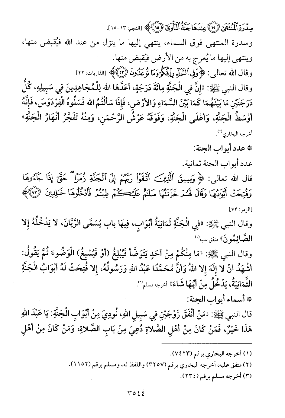 وقال النبي - صلى الله عليه وسلم -: «إِنَّ فِي الْجَنَّةِ مِائَةَ دَرَجَةٍ، أعَدَّهَا الله لِلْمُجَاهِدِينَ فِي سَبِيلِهِ، كُلُّ دَرَجَتَيْنِ مَا بَيْنَهُمَا كَمَا بَيْنَ السَّمَاءِ وَالأرْضِ، فَإِذَا سَألْتُمُ الله فَسَلُوهُ الْفِرْدَوْسَ، فَإِنَّهُ أوْسَطُ الْجَنَّةِ، وَأعْلَى الْجَنَّةِ، وَفَوْقَهُ عَرْشُ الرَّحْمَنِ، وَمِنْهُ تَفَجَّرُ أنْهَارُ الْجَنَّةِ» أخرجه البخاري (¬1).