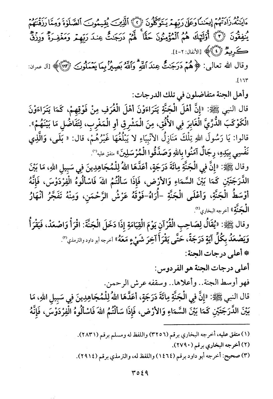 وقال - صلى الله عليه وسلم -: «إِنَّ فِي الْجَنَّةِ مِائَةَ دَرَجَةٍ، أعَدَّهَا اللهُ لِلْمُجَاهِدِينَ فِي سَبِيلِ اللهِ، مَا بَيْنَ الدَّرَجَتَيْنِ كَمَا بَيْنَ السَّمَاءِ وَالأرْض، فَإِذَا سَألْتُمُ اللهَ فَاسْألُوهُ الْفِرْدَوْسَ، فَإِنَّهُ
