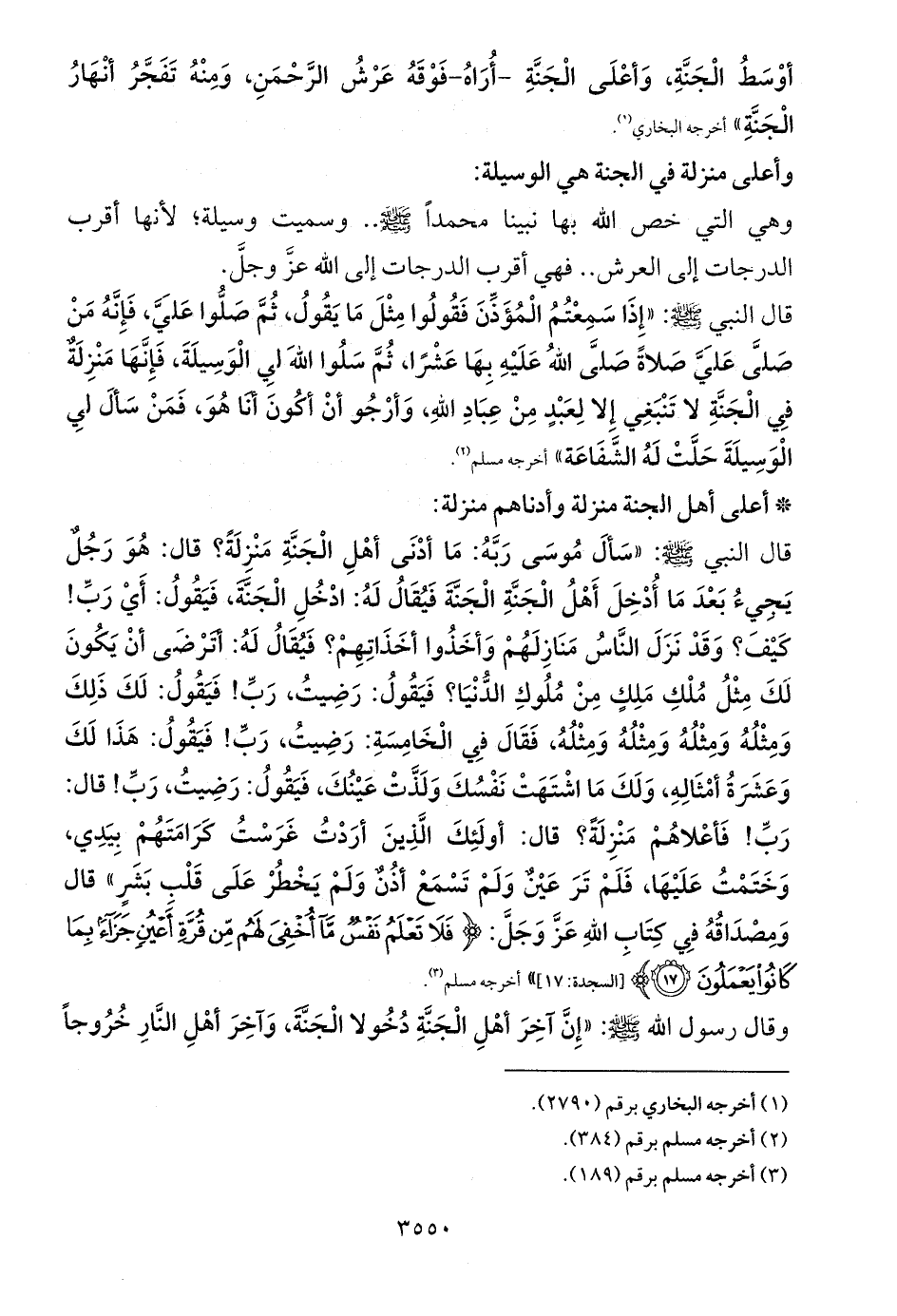 قال النبي - صلى الله عليه وسلم -: «سَألَ مُوسَى رَبَّهُ: مَا أدْنَى أهْلِ الْجَنَّةِ مَنْزِلَةً؟ قال: هُوَ رَجُلٌ يَجِيءُ بَعْدَ مَا أُدْخِلَ أَهْلُ الْجَنَّةِ الْجَنَّةَ فَيُقَالُ لَهُ: ادْخُلِ الْجَنَّةَ، فَيَقُولُ: أَيْ رَبِّ! كَيْفَ؟ وَقَدْ نَزَلَ النَّاسُ مَنَازِلَهُمْ وَأخَذُوا أخَذَاتِهِمْ؟ فَيُقَالُ لَهُ: أتَرْضَى أنْ يَكُونَ لَكَ مِثْلُ مُلْكِ مَلِكٍ مِنْ مُلُوكِ الدُّنْيَا؟ فَيَقُولُ: رَضِيتُ، رَبِّ! فَيَقُولُ: لَكَ ذَلِكَ وَمِثْلُهُ وَمِثْلُهُ وَمِثْلُهُ وَمِثْلُهُ، فَقَالَ فِي الْخَامِسَةِ: رَضِيتُ، رَبِّ! فَيَقُولُ: هَذَا لَكَ وَعَشَرَةُ أمْثَالِهِ، وَلَكَ مَا اشْتَهَتْ نَفْسُكَ وَلَذَّتْ عَيْنُكَ، فَيَقُولُ: رَضِيتُ، رَبِّ! قال: رَبِّ! فَأعْلاهُمْ مَنْزِلَةً؟ قال: أولَئِكَ الَّذِينَ أرَدْتُ غَرَسْتُ كَرَامَتَهُمْ بِيَدِي، وَخَتَمْتُ عَلَيْهَا، فَلَمْ تَرَ عَيْنٌ وَلَمْ تَسْمَعْ أذُنٌ وَلَمْ يَخْطُرْ عَلَى قَلْبِ بَشَرٍ» قال وَمِصْدَاقُهُ فِي كِتَابِ اللهِ عَزَّ وَجَلَّ: {فَلَا تَعْلَمُ نَفْسٌ مَا أُخْفِيَ لَهُمْ مِنْ قُرَّةِ أَعْيُنٍ جَزَاءً بِمَا كَانُوا يَعْمَلُونَ (17)} [السجدة: 17]» أخرجه مسلم (¬5).