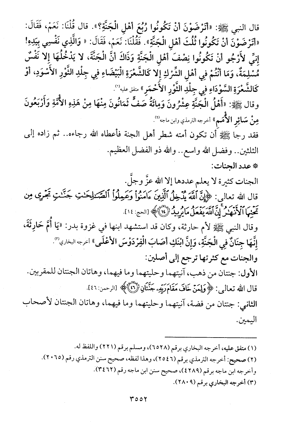 قال النبي - صلى الله عليه وسلم -: «أتَرْضَوْنَ أنْ تَكُونُوا رُبُعَ أهْلِ الْجَنَّةِ؟». قال قُلْنَا: نَعَمْ، فَقَالَ: «أتَرْضَوْنَ أنْ تَكُونُوا ثُلُثَ أهْلِ الْجَنَّةِ». فَقُلْنَا: نَعَمْ، فَقَالَ: «وَالَّذِي نَفْسِي بِيَدِهِ! إِنِّي لأَرْجُو أنْ تَكُونُوا نِصْفَ أهْلِ الْجَنَّةِ وَذَاكَ أنَّ الْجَنَّةَ، لا يَدْخُلُهَا إِلا نَفْسٌ مُسْلِمَةٌ، وَمَا أنْتُمْ فِي أهْلِ الشِّرْكِ إِلا كَالشَّعْرَةِ الْبَيْضَاءِ فِي جِلْدِ الثَّوْرِ الأَسْوَدِ، أوْ كَالشَّعْرَةِ السَّوْدَاءِ فِي جِلْدِ الثَّوْرِ الأَحْمَرِ» متفق عليه (¬1).