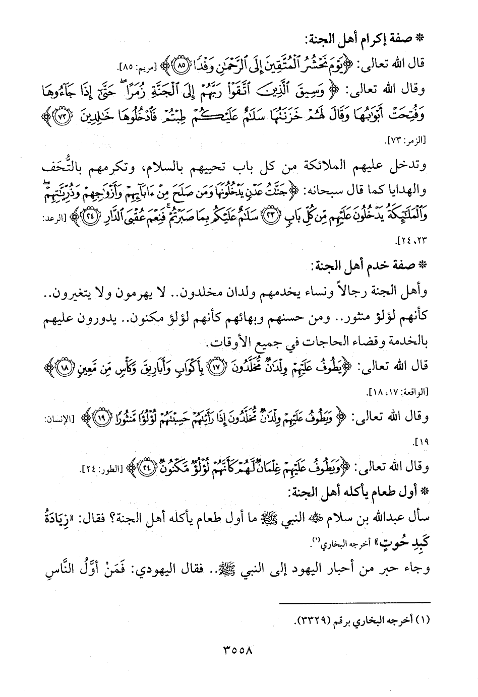 سأل عبد الله بن سلام - رضي الله عنه - النبي - صلى الله عليه وسلم - ما أول طعام يأكله أهل الجنة؟ فقال: «زِيَادَةُ كَبِدِ حُوتٍ» أخرجه البخاري (¬1).