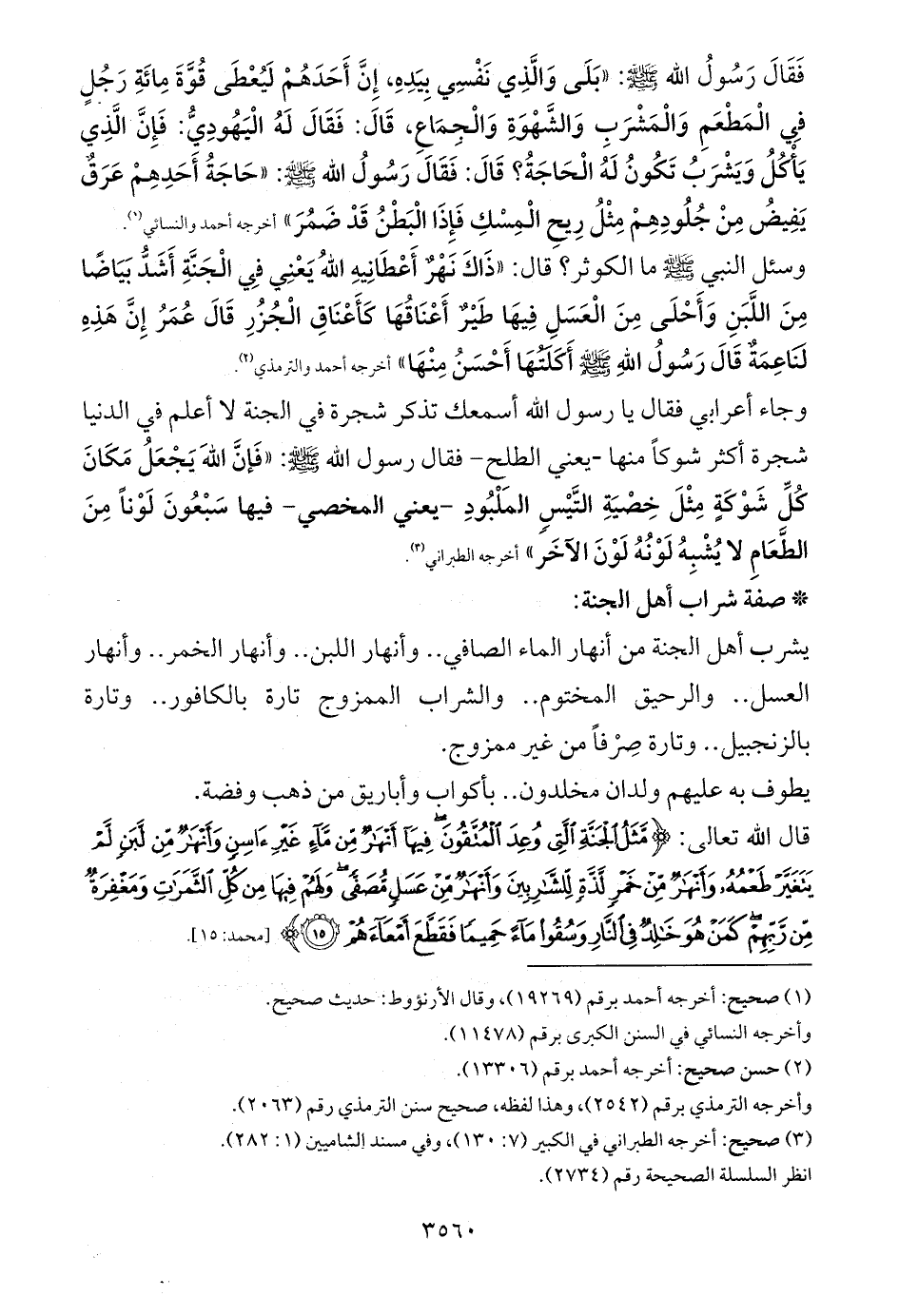 فَقَالَ رَسُولُ الله - صلى الله عليه وسلم -: «بَلَى وَالَّذِي نَفْسِي بِيَدِهِ، إِنَّ أَحَدَهُمْ لَيُعْطَى قُوَّةَ مِائَةِ رَجُلٍ فِي الْمَطْعَمِ وَالْمَشْرَبِ وَالشَّهْوَةِ وَالْجِمَاعِ، قَالَ: فَقَالَ لَهُ الْيَهُودِيُّ: فَإِنَّ الَّذِي يَأْكُلُ وَيَشْرَبُ تَكُونُ لَهُ الْحَاجَةُ؟ قَالَ: فَقَالَ رَسُولُ الله - صلى الله عليه وسلم -: «حَاجَةُ أَحَدِهِمْ عَرَقٌ يَفِيضُ مِنْ جُلُودِهِمْ مِثْلُ رِيحِ الْمِسْكِ فَإِذَا الْبَطْنُ قَدْ ضَمُرَ» أخرجه أحمد والنسائي (¬1).