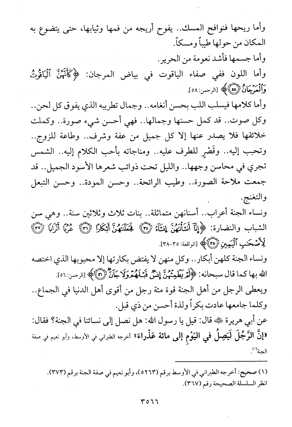 وأما كلامها فيسلب اللب بحسن أنغامه .. وجمال تطريبه الذي يفوق كل لحن .. وكل صوت .. قد كمل حسنها وجمالها .. فهي أحسن شيء صورة .. وكملت خلائقها فلا يصدر عنها إلا كل جميل من عفة وشرف .. وطاعة للزوج .. وتحبب إليه .. وقَصْرٍ للطرف عليه .. ومناجاته بأحب الكلام إليه .. الشمس تجري في محاسن وجهها .. والليل تحت ذوائب شعرها الأسود الجميل .. قد جمعت ملاحة الصورة .. وطيب الرائحة .. وحسن المودة .. وحسن التبعل والتغنج.
