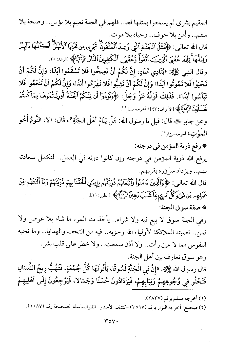 وقال النبي - صلى الله عليه وسلم -: «يُنَادِي مُنَادٍ، إِنَّ لَكُمْ أنْ تَصِحُّوا فَلا تَسْقَمُوا أبَدًا، وَإِنَّ لَكُمْ أنْ تَحْيَوْا فَلا تَمُوتُوا أبَدًا» وَإِنَّ لَكُمْ أنْ تَشِبُّوا فَلا تَهْرَمُوا أبَدًا، وَإِنَّ لَكُمْ أنْ تَنْعَمُوا فَلا تَبْأسُوا أبَدًا». فَذَلِكَ قَوْلُهُ عَزَّ وَجَلَّ: {وَنُودُوا أَنْ تِلْكُمُ الْجَنَّةُ أُورِثْتُمُوهَا بِمَا كُنْتُمْ تَعْمَلُونَ (43)} [الأعراف: 43]» أخرجه مسلم (¬1).