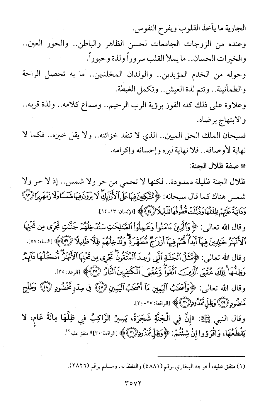 وقال النبي - صلى الله عليه وسلم -: «إِنَّ فِي الْجَنَّةِ شَجَرَةً، يَسِيرُ الرَّاكِبُ فِي ظِلِّهَا مِائَةَ عَامٍ، لا يَقْطَعُهَا، وَاقْرَؤوا إِنْ شِئْتُمْ: {وَظِلٍّ مَمْدُودٍ (30)} [الواقعة:30]» متفق عليه (¬1).