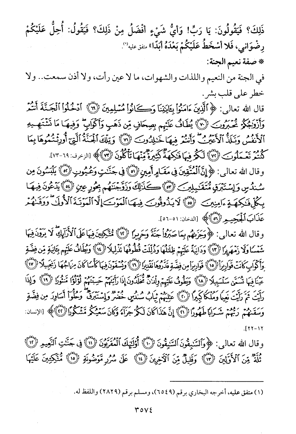 قال الله تعالى: {الَّذِينَ آمَنُوا بِآيَاتِنَا وَكَانُوا مُسْلِمِينَ (69) ادْخُلُوا الْجَنَّةَ أَنْتُمْ وَأَزْوَاجُكُمْ تُحْبَرُونَ (70) يُطَافُ عَلَيْهِمْ بِصِحَافٍ مِنْ ذَهَبٍ وَأَكْوَابٍ وَفِيهَا مَا تَشْتَهِيهِ الْأَنْفُسُ وَتَلَذُّ الْأَعْيُنُ وَأَنْتُمْ فِيهَا خَالِدُونَ (71) وَتِلْكَ الْجَنَّةُ الَّتِي أُورِثْتُمُوهَا بِمَا كُنْتُمْ تَعْمَلُونَ (72) لَكُمْ فِيهَا فَاكِهَةٌ كَثِيرَةٌ مِنْهَا تَأْكُلُونَ (73)} [الزخرف: 69 - 73].