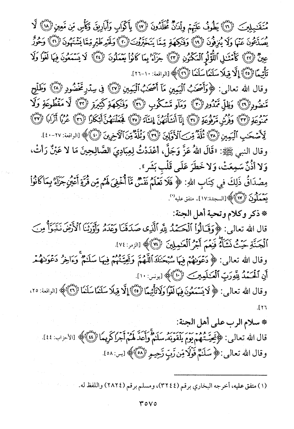 مُتَقَابِلِينَ (16) يَطُوفُ عَلَيْهِمْ وِلْدَانٌ مُخَلَّدُونَ (17) بِأَكْوَابٍ وَأَبَارِيقَ وَكَأْسٍ مِنْ مَعِينٍ (18) لَا يُصَدَّعُونَ عَنْهَا وَلَا يُنْزِفُونَ (19) وَفَاكِهَةٍ مِمَّا يَتَخَيَّرُونَ (20) وَلَحْمِ طَيْرٍ مِمَّا يَشْتَهُونَ (21) وَحُورٌ عِينٌ (22) كَأَمْثَالِ اللُّؤْلُؤِ الْمَكْنُونِ (23) جَزَاءً بِمَا كَانُوا يَعْمَلُونَ (24) لَا يَسْمَعُونَ فِيهَا لَغْوًا وَلَا تَأْثِيمًا (25) إِلَّا قِيلًا سَلَامًا سَلَامًا (26)} [الواقعة: 10 - 26].