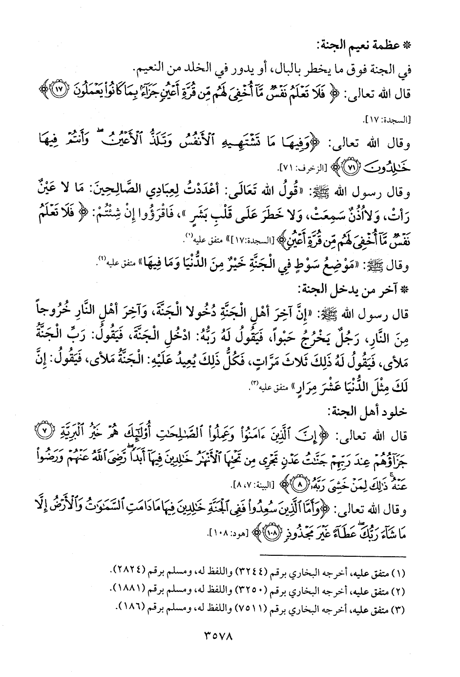 وقال رسول الله - صلى الله عليه وسلم -: «قُولُ الله تَعَالَى: أعْدَدْتُ لِعِبَادِي الصَّالِحِينَ: مَا لا عَيْنٌ رَأتْ، وَلااُذُنٌ سَمِعَتْ، وَلا خَطَرَ عَلَى قَلْبِ بَشَرٍ»، فَاقْرَؤُوا إِنْ شِئْتُمْ: {فَلَا تَعْلَمُ نَفْسٌ مَا أُخْفِيَ لَهُمْ مِنْ قُرَّةِ أَعْيُنٍ} [السجدة:17]» متفق عليه (¬1).