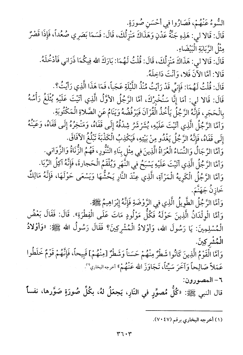 قَالَ: قَالا لِي: أمَا إِنَّا سَنُخْبِرُكَ، أمَّا الرَّجُلُ الأوَّلُ الَّذِي أتَيْتَ عَلَيْهِ يُثْلَغُ رَأْسُهُ بِالْحَجَرِ، فَإِنَّهُ الرَّجُلُ يَأْخُذُ الْقُرْآنَ فَيَرْفُضُهُ وَيَنَامُ عَنِ الصَّلاةِ الْمَكْتُوبَةِ.