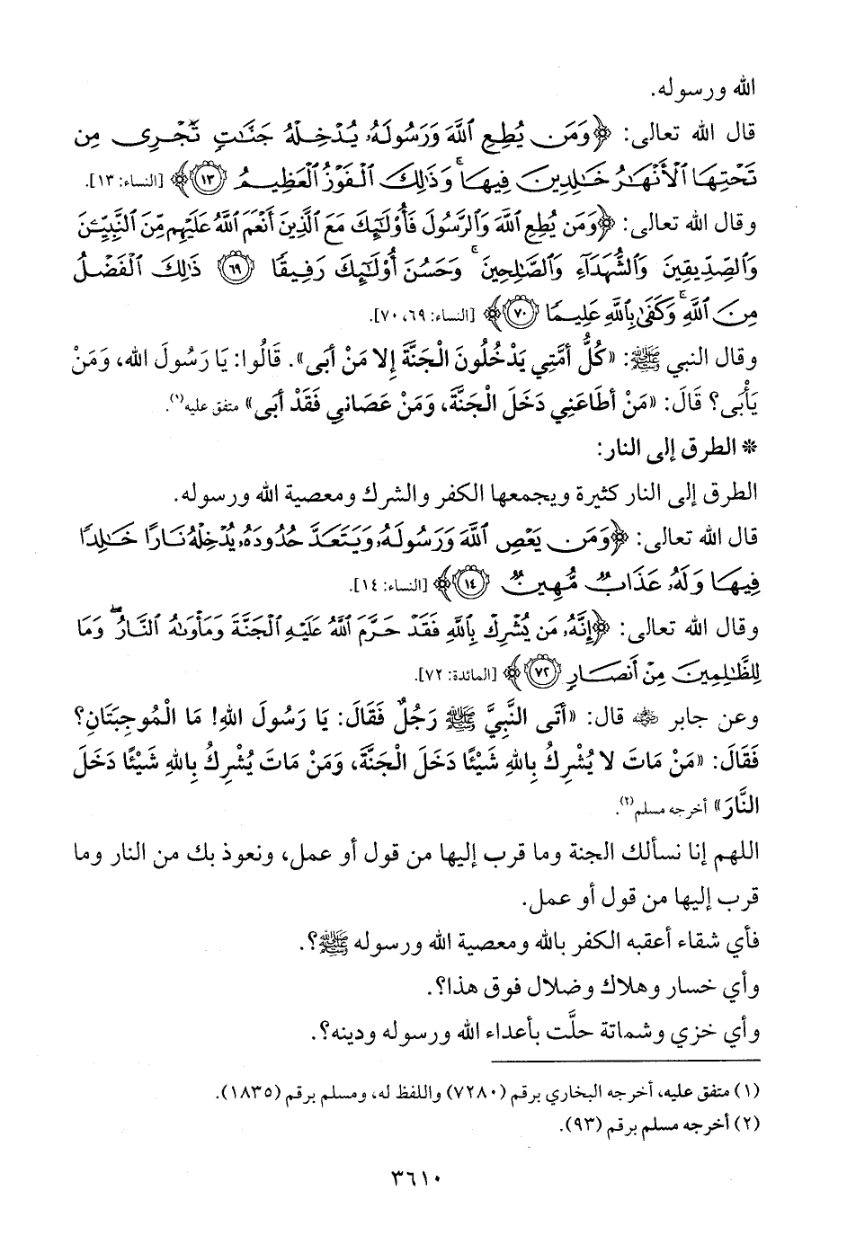 وعن جابر - رضي الله عنه - قال: «أتَى النَّبِيَّ (رَجُلٌ فَقَالَ: يَا رَسُولَ اللهِ! مَا الْمُوجِبَتَانِ؟ فَقَالَ: «مَنْ مَاتَ لا يُشْرِكُ بِاللهِ شَيْئًا دَخَلَ الْجَنَّةَ، وَمَنْ مَاتَ يُشْرِكُ بِاللهِ شَيْئًا دَخَلَ النَّارَ» أخرجه مسلم (¬2).
