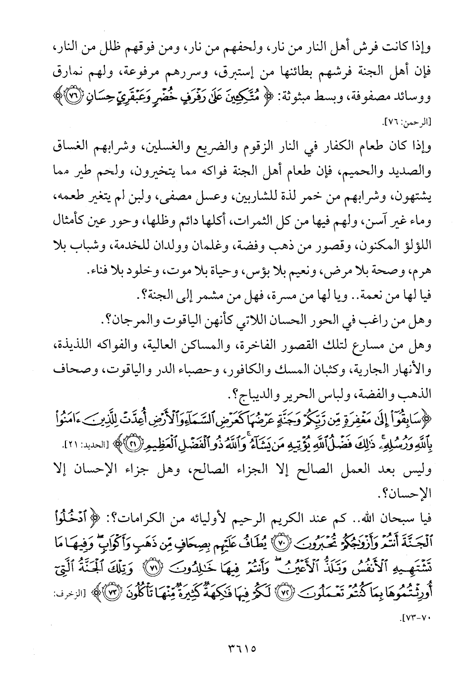 وهل من مسارع لتلك القصور الفاخرة، والمساكن العالية، والفواكه اللذيذة، والأنهار الجارية، وكثبان المسك والكافور، وحصباء الدر والياقوت، وصحاف الذهب والفضة، ولباس الحرير والديباج؟.