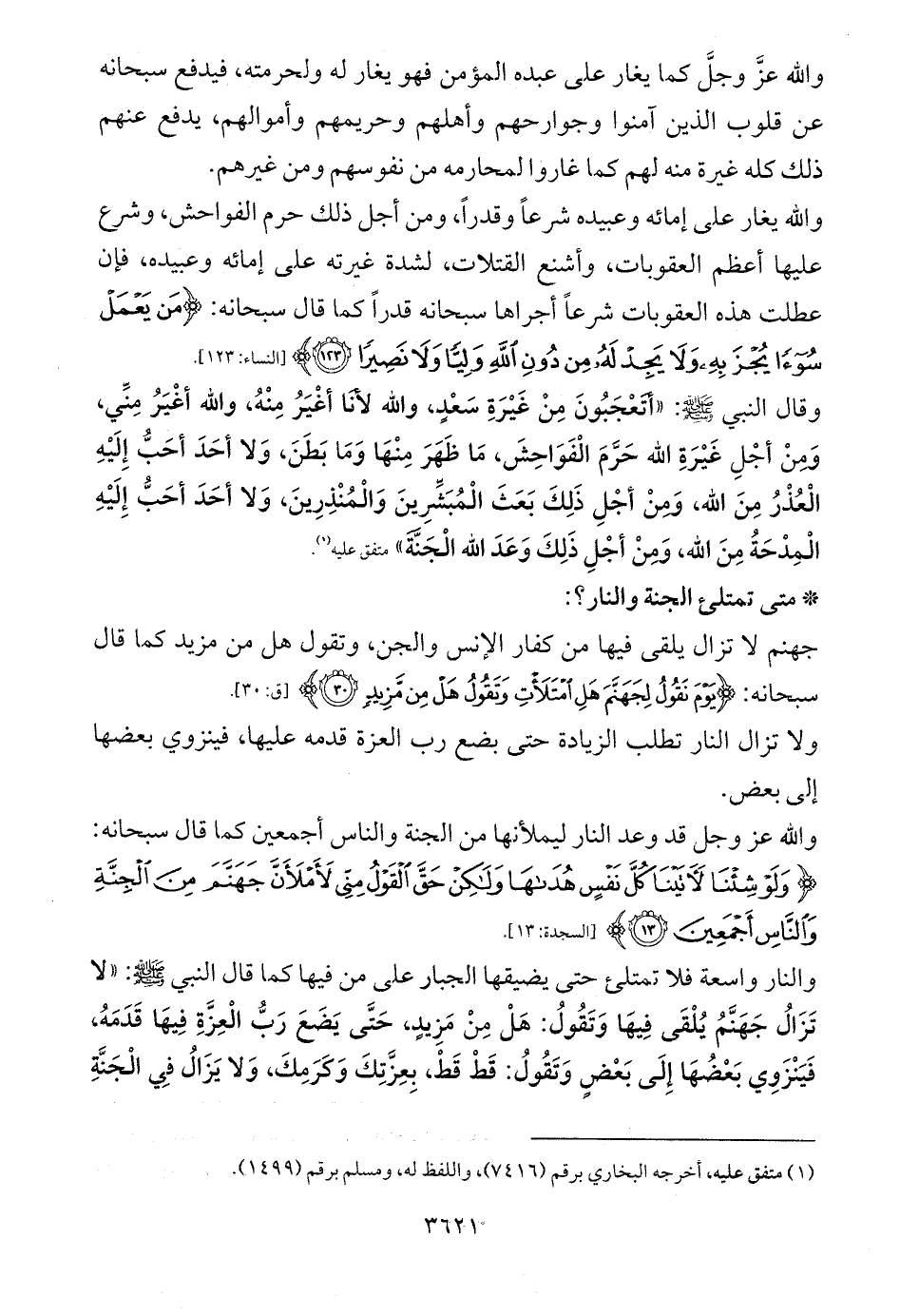 والنار واسعة فلا تمتلئ حتى يضيقها الجبار على من فيها كما قال النبي (: «لا تَزَالُ جَهَنَّمُ يُلْقَى فِيهَا وَتَقُولُ: هَلْ مِنْ مَزِيدٍ، حَتَّى يَضَعَ رَبُّ الْعِزَّةِ فِيهَا قَدَمَهُ، فَيَنْزَوِي بَعْضُهَا إِلَى بَعْضٍ وَتَقُولُ: قَطْ قَطْ، بِعِزَّتِكَ وَكَرَمِكَ، وَلا يَزَالُ فِي الْجَنَّةِ