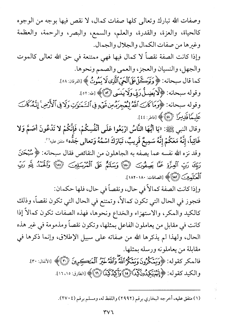 وقد نزه الله نفسه عما يصفه به الجاهلون من النقائص فقال سبحانه: {سُبْحَانَ رَبِّكَ رَبِّ الْعِزَّةِ عَمَّا يَصِفُونَ (180) وَسَلَامٌ عَلَى الْمُرْسَلِينَ (181) وَالْحَمْدُ لِلَّهِ رَبِّ الْعَالَمِينَ (182)} [الصافات: 180 - 182].