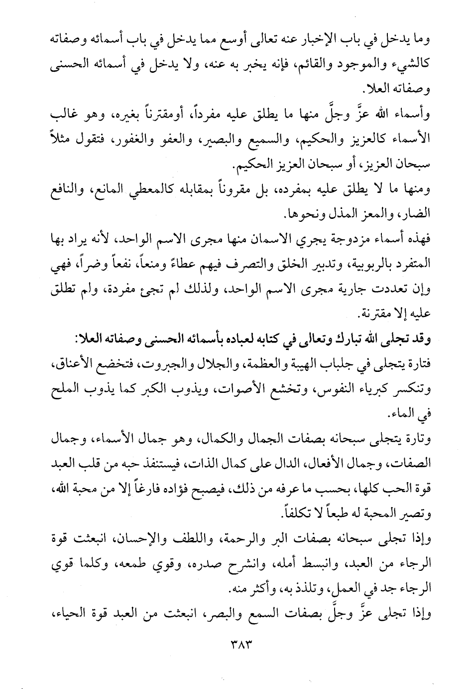 وتارة يتجلى سبحانه بصفات الجمال والكمال، وهو جمال الأسماء، وجمال الصفات، وجمال الأفعال، الدال على كمال الذات، فيستنفذ حبه من قلب العبد قوة الحب كلها، بحسب ما عرفه من ذلك، فيصبح فؤاده فارغاً إلا من محبة الله، وتصير المحبة له طبعاً لا تكلفاً.