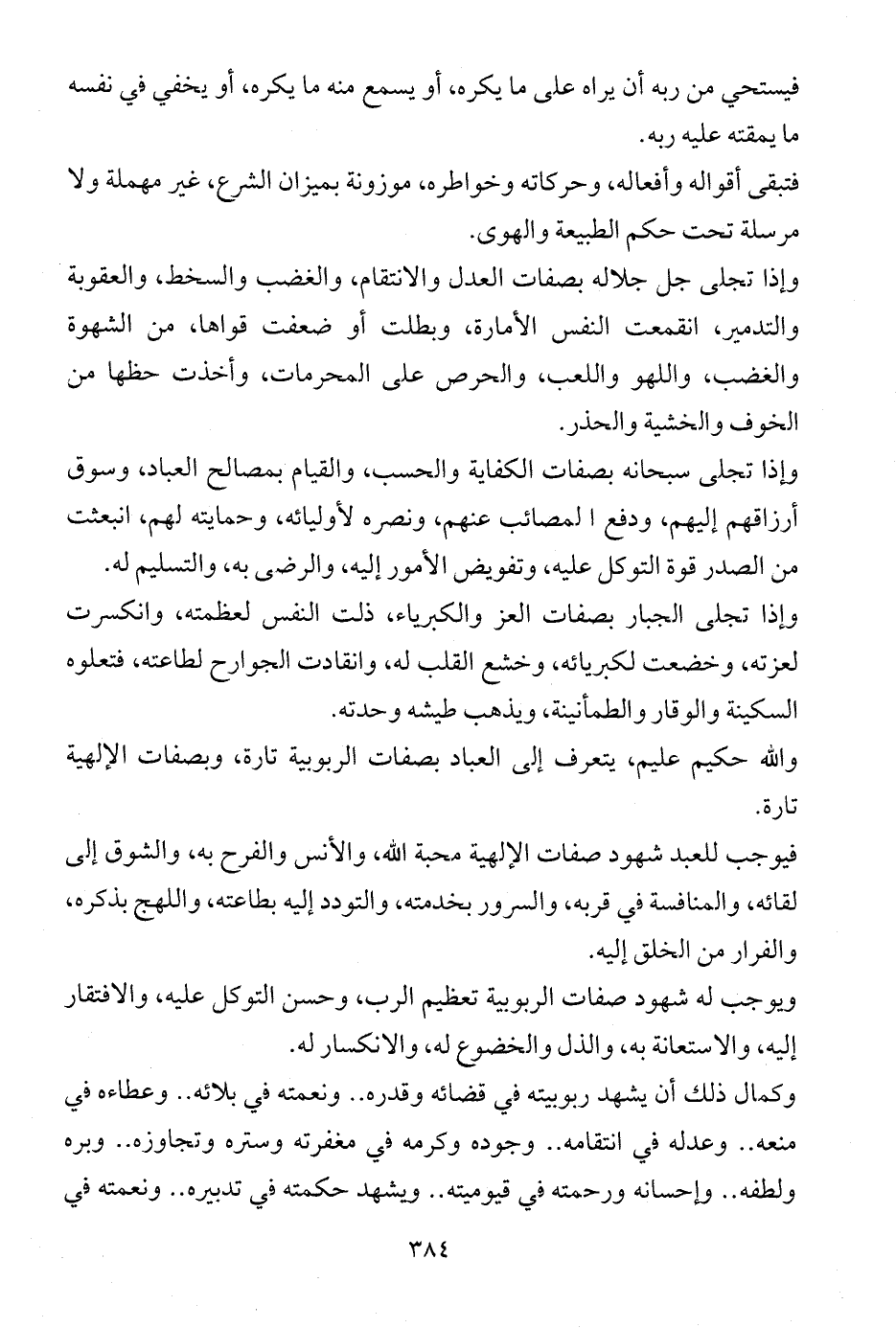 وإذا تجلى جل جلاله بصفات العدل والانتقام، والغضب والسخط، والعقوبة والتدمير، انقمعت النفس الأمارة، وبطلت أو ضعفت قواها، من الشهوة والغضب، واللهو واللعب، والحرص على المحرمات، وأخذت حظها من الخوف والخشية والحذر.