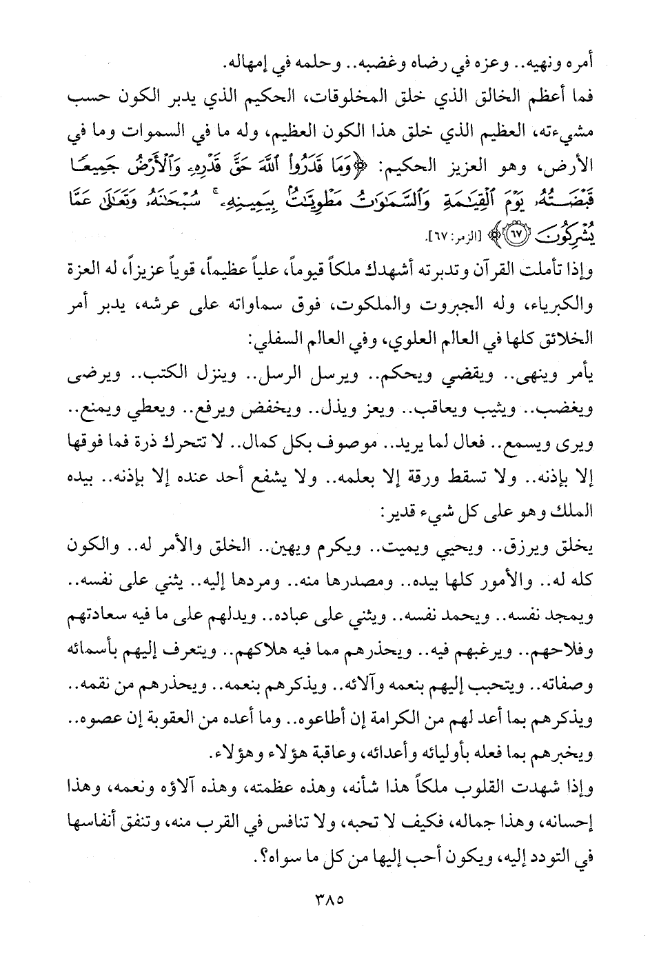 يخلق ويرزق .. ويحيي ويميت .. ويكرم ويهين .. الخلق والأمر له .. والكون كله له .. والأمور كلها بيده .. ومصدرها منه .. ومردها إليه .. يثني على نفسه .. ويمجد نفسه .. ويحمد نفسه .. ويثني على عباده .. ويدلهم على ما فيه سعادتهم وفلاحهم .. ويرغبهم فيه .. ويحذرهم مما فيه هلاكهم .. ويتعرف إليهم بأسمائه وصفاته .. ويتحبب إليهم بنعمه وآلائه .. ويذكرهم بنعمه .. ويحذرهم من نقمه .. ويذكرهم بما أعد لهم من الكرامة إن أطاعوه .. وما أعده من العقوبة إن عصوه .. ويخبرهم بما فعله بأوليائه وأعدائه، وعاقبة هؤلاء وهؤلاء.