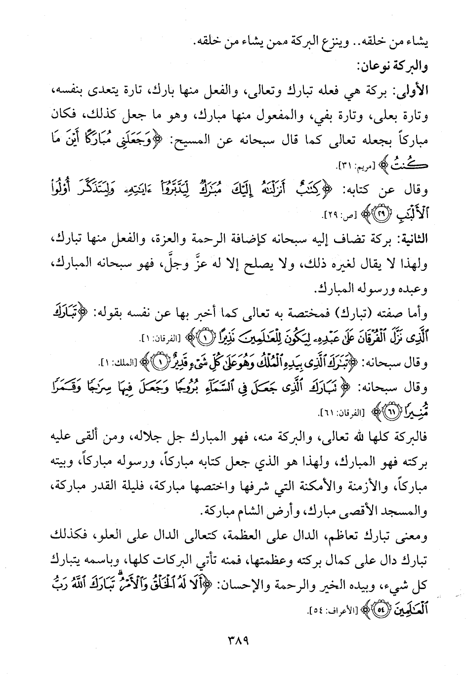 الثانية: بركة تضاف إليه سبحانه كإضافة الرحمة والعزة، والفعل منها تبارك، ولهذا لا يقال لغيره ذلك، ولا يصلح إلا له عزَّ وجلَّ، فهو سبحانه المبارك، وعبده ورسوله المبارك.