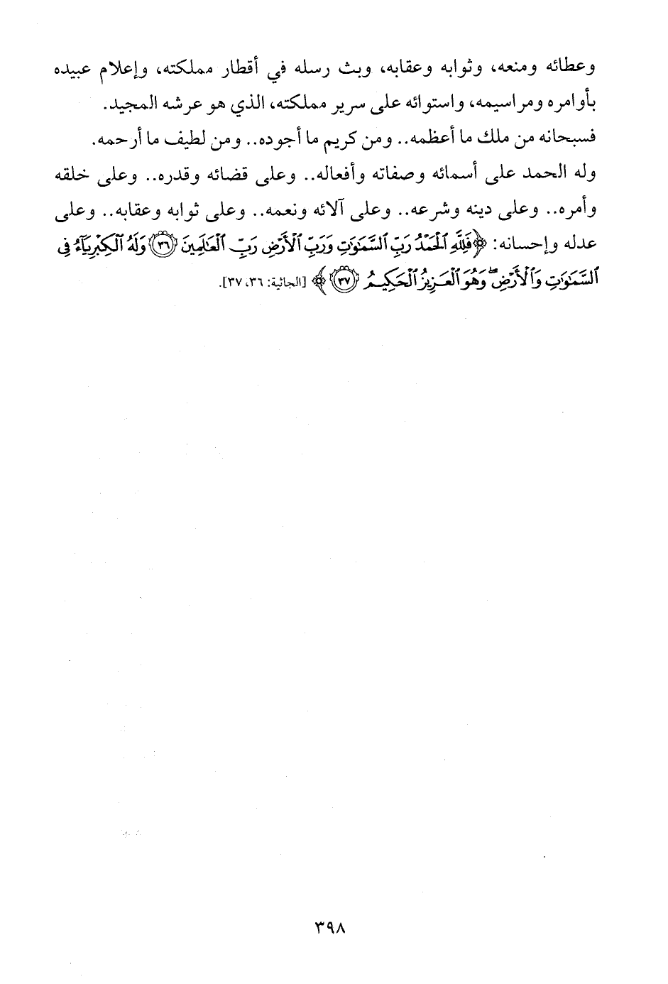 وله الحمد على أسمائه وصفاته وأفعاله .. وعلى قضائه وقدره .. وعلى خلقه وأمره .. وعلى دينه وشرعه .. وعلى آلائه ونعمه .. وعلى ثوابه وعقابه .. وعلى عدله وإحسانه: {فَلِلَّهِ الْحَمْدُ رَبِّ السَّمَاوَاتِ وَرَبِّ الْأَرْضِ رَبِّ الْعَالَمِينَ (36) وَلَهُ الْكِبْرِيَاءُ فِي السَّمَاوَاتِ وَالْأَرْضِ وَهُوَ الْعَزِيزُ الْحَكِيمُ (37)} [الجاثية: 36، 37].