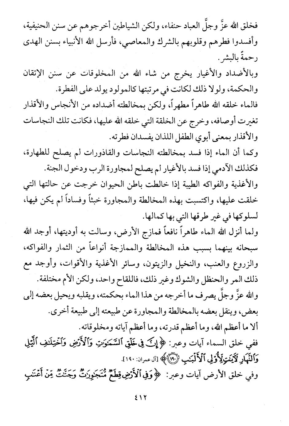 فالماء خلقه الله طاهراً مطهراً، ولكن بمخالطته أضداده من الأنجاس والأقذار تغيرت أوصافه، وخرج عن الخلقة التي خلقه الله عليها، فكانت تلك النجاسات والأقذار بمعنى أبوي الطفل اللذان يفسدان فطرته.