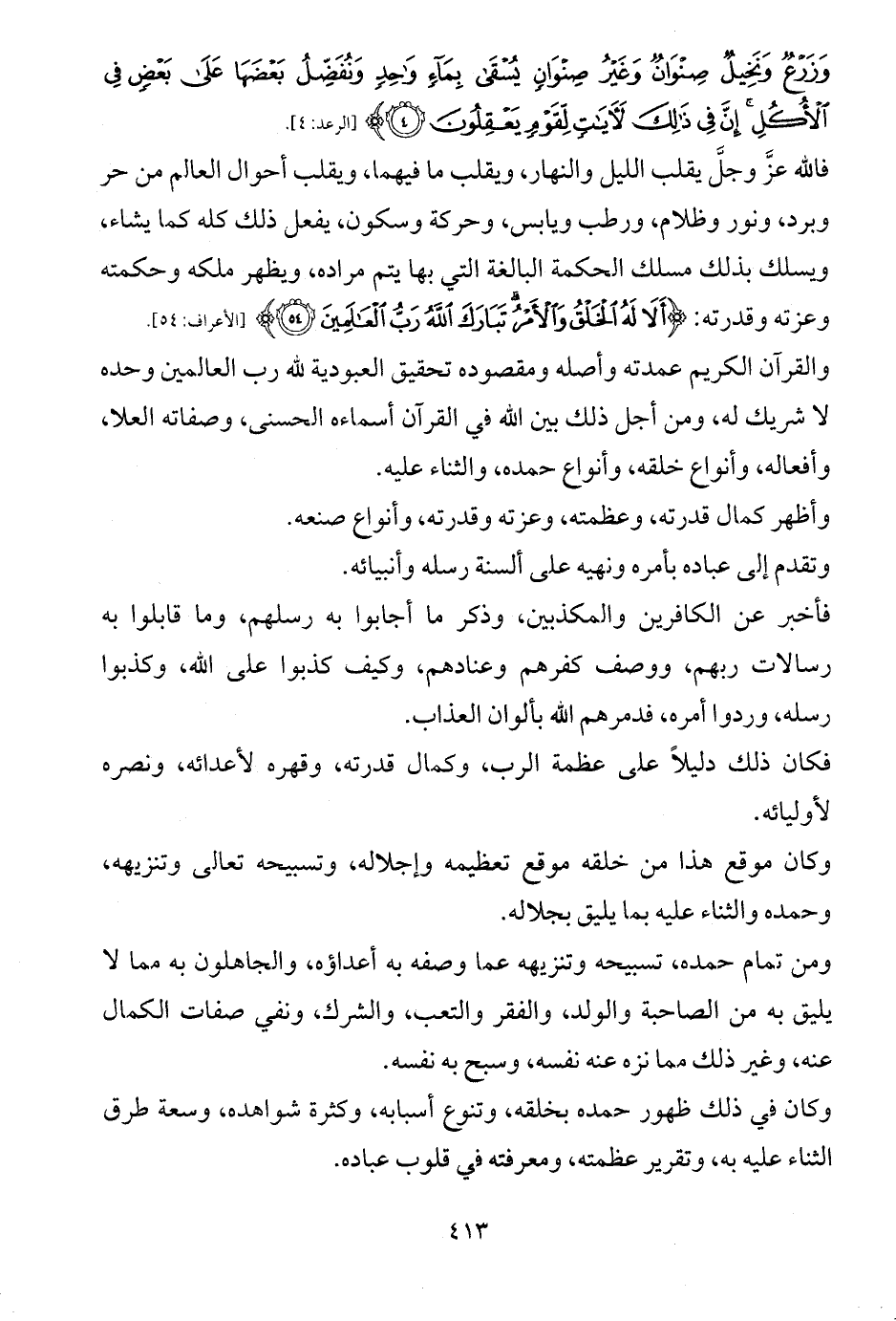 والقرآن الكريم عمدته وأصله ومقصوده تحقيق العبودية لله رب العالمين وحده لا شريك له، ومن أجل ذلك بين الله في القرآن أسماءه الحسنى، وصفاته العلا، وأفعاله، وأنواع خلقه، وأنواع حمده، والثناء عليه.