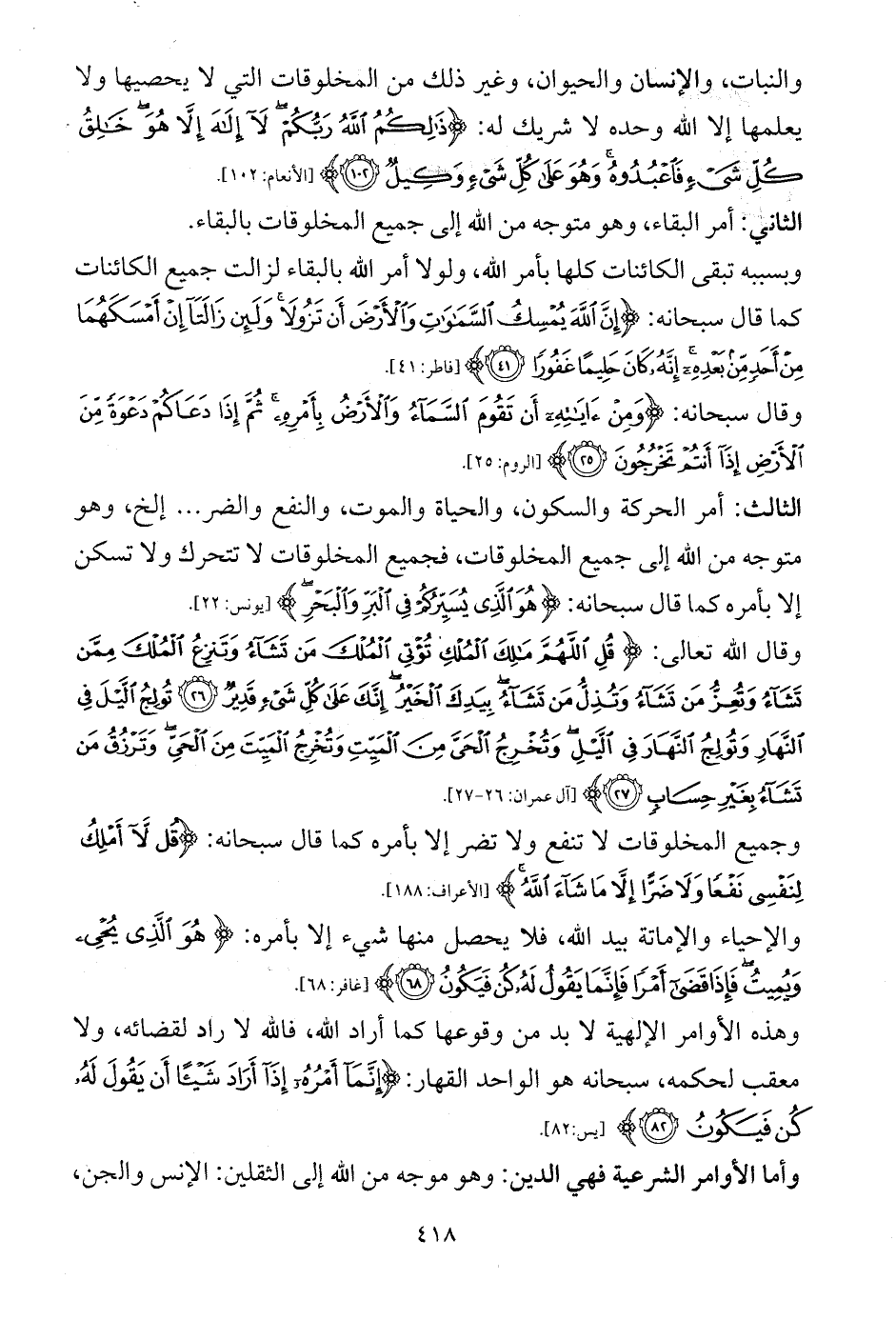 الثالث: أمر الحركة والسكون، والحياة والموت، والنفع والضر ... إلخ، وهو متوجه من الله إلى جميع المخلوقات، فجميع المخلوقات لا تتحرك ولا تسكن إلا بأمره كما قال سبحانه: {هُوَ الَّذِي يُسَيِّرُكُمْ فِي الْبَرِّ وَالْبَحْرِ} [يونس: 22].