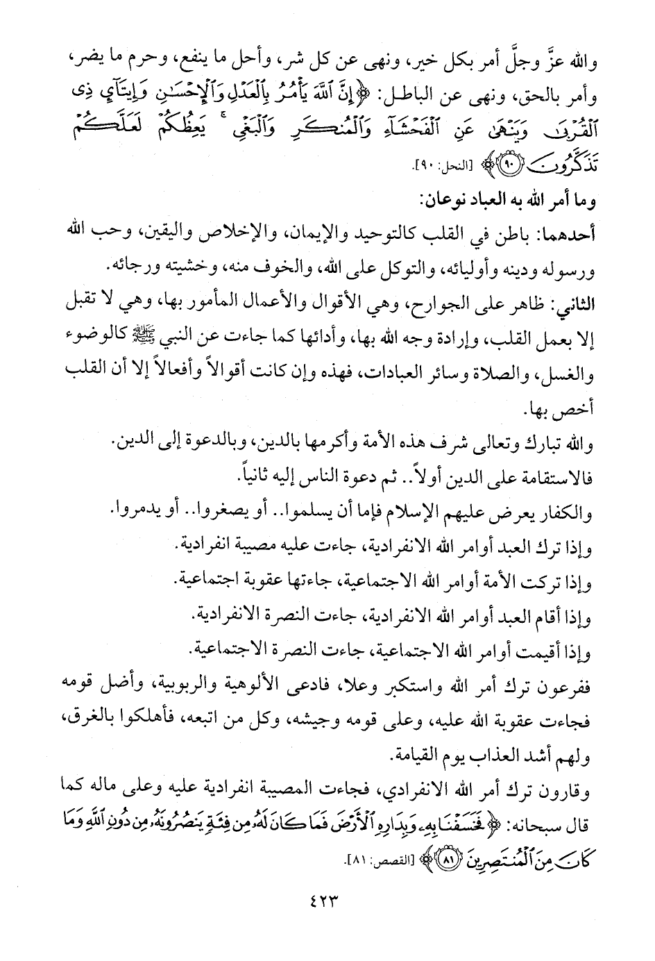 الثاني: ظاهر على الجوارح، وهي الأقوال والأعمال المأمور بها، وهي لا تقبل إلا بعمل القلب، وإرادة وجه الله بها، وأدائها كما جاءت عن النبي - صلى الله عليه وسلم - كالوضوء والغسل، والصلاة وسائر العبادات، فهذه وإن كانت أقوالاً وأفعالاً إلا أن القلب أخص بها.