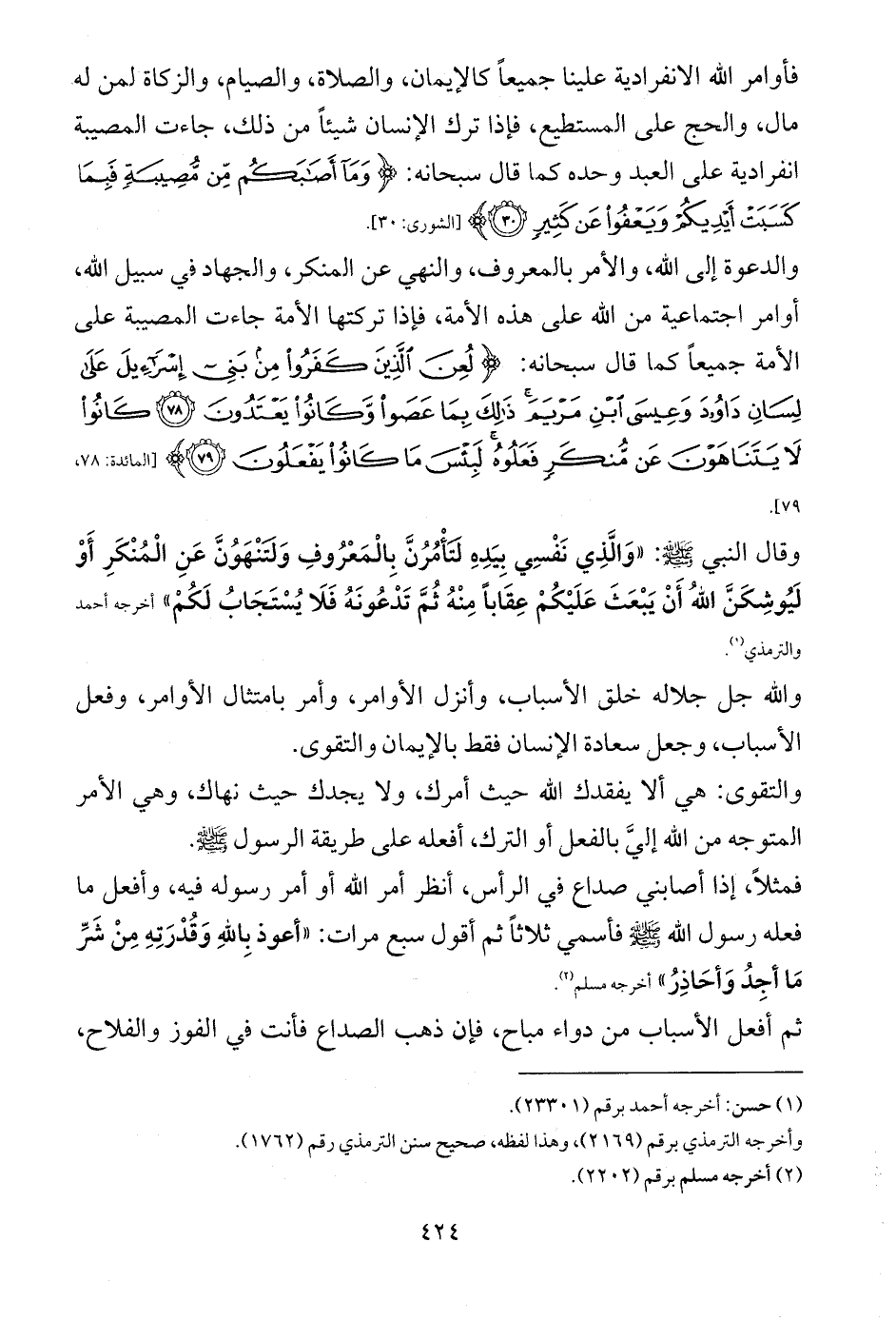 والدعوة إلى الله، والأمر بالمعروف، والنهي عن المنكر، والجهاد في سبيل الله، أوامر اجتماعية من الله على هذه الأمة، فإذا تركتها الأمة جاءت المصيبة على الأمة جميعاً كما قال سبحانه: {لُعِنَ الَّذِينَ كَفَرُوا مِنْ بَنِي إِسْرَائِيلَ عَلَى لِسَانِ دَاوُودَ وَعِيسَى ابْنِ مَرْيَمَ ذَلِكَ بِمَا عَصَوْا وَكَانُوا يَعْتَدُونَ (78) كَانُوا لَا يَتَنَاهَوْنَ عَنْ مُنْكَرٍ فَعَلُوهُ لَبِئْسَ مَا كَانُوا يَفْعَلُونَ (79)} [المائدة: 78، 79].